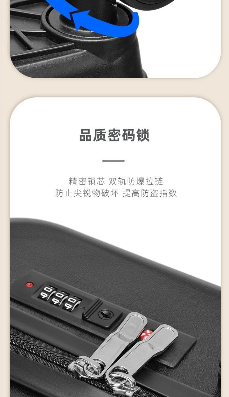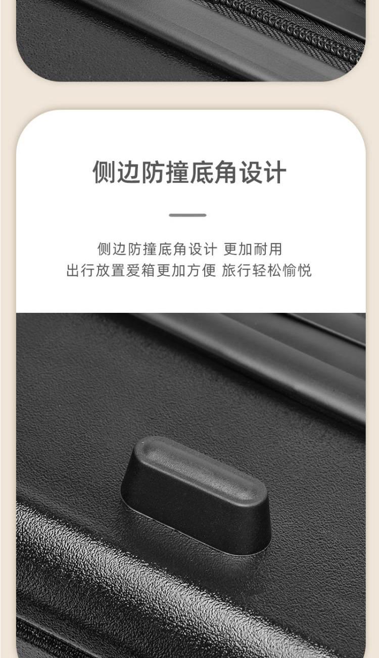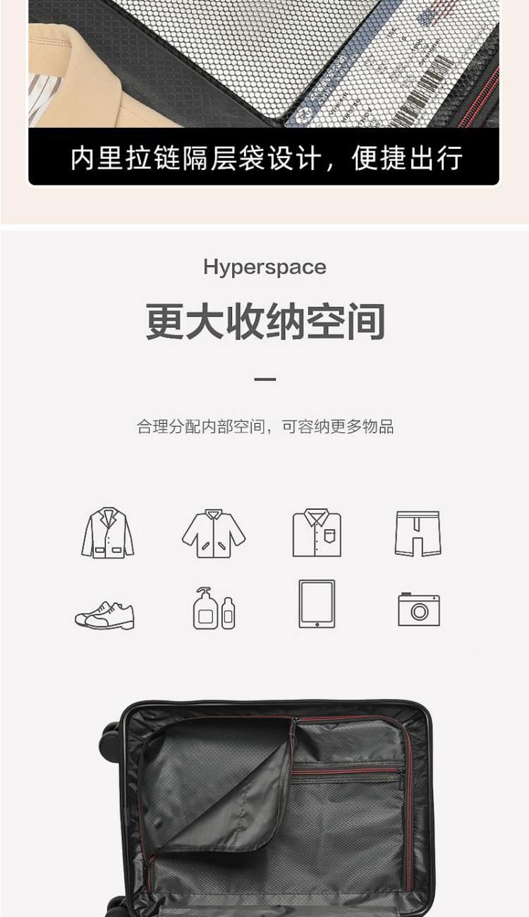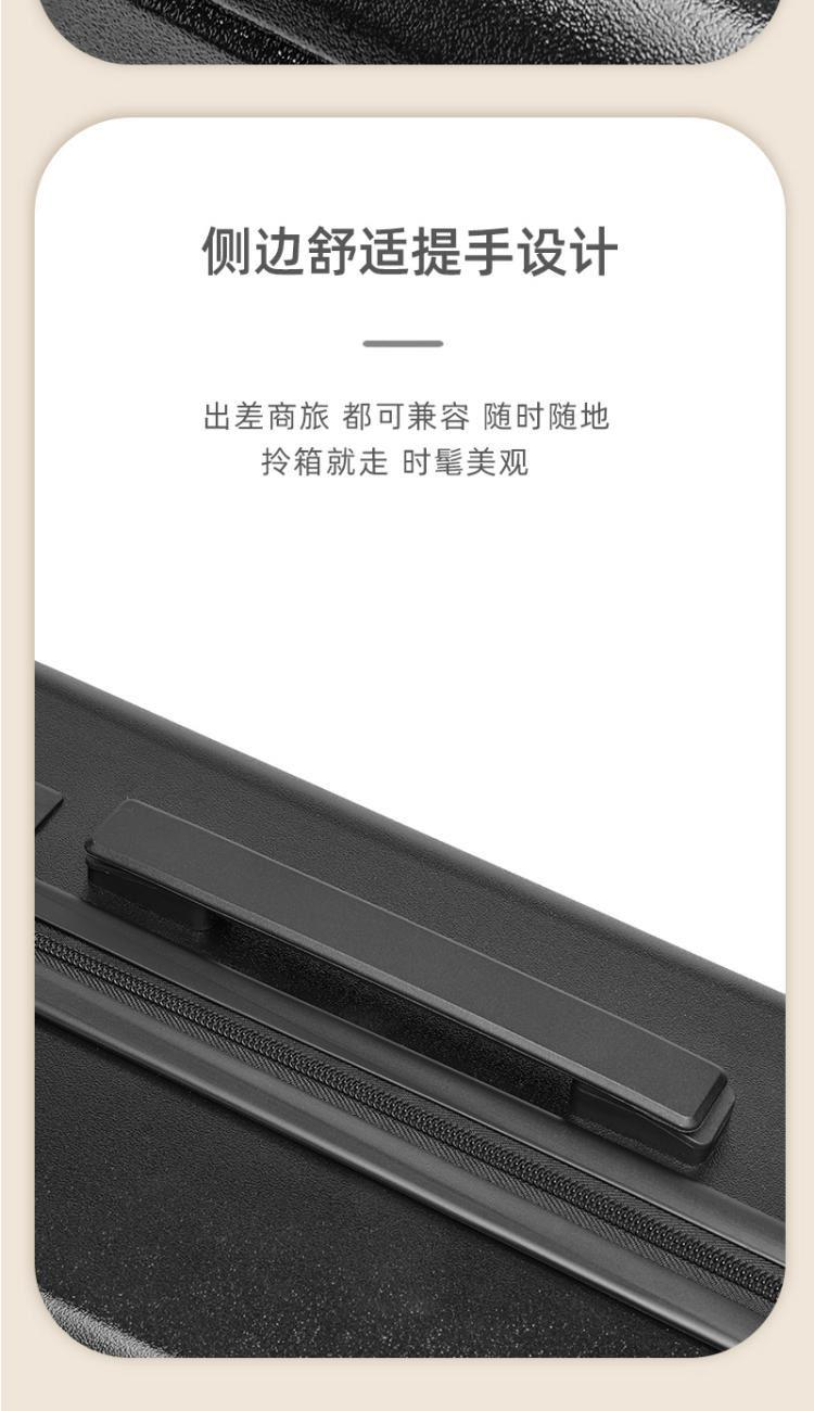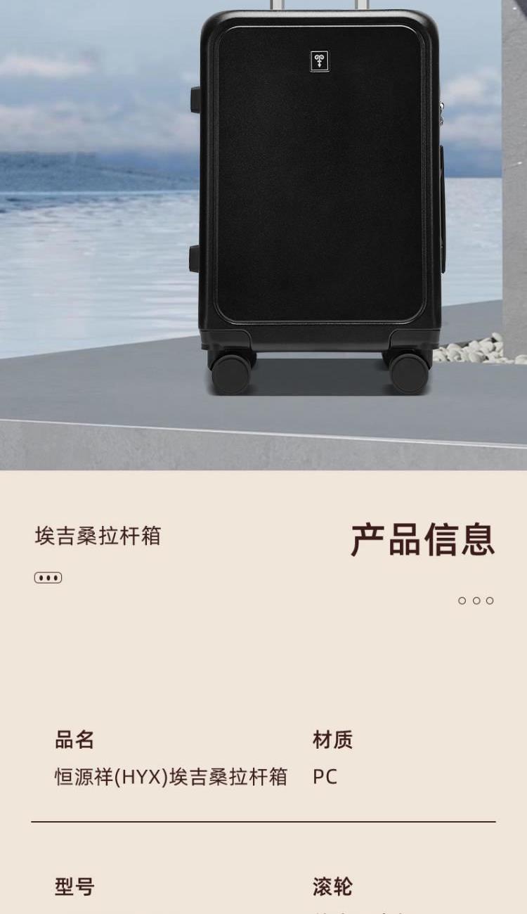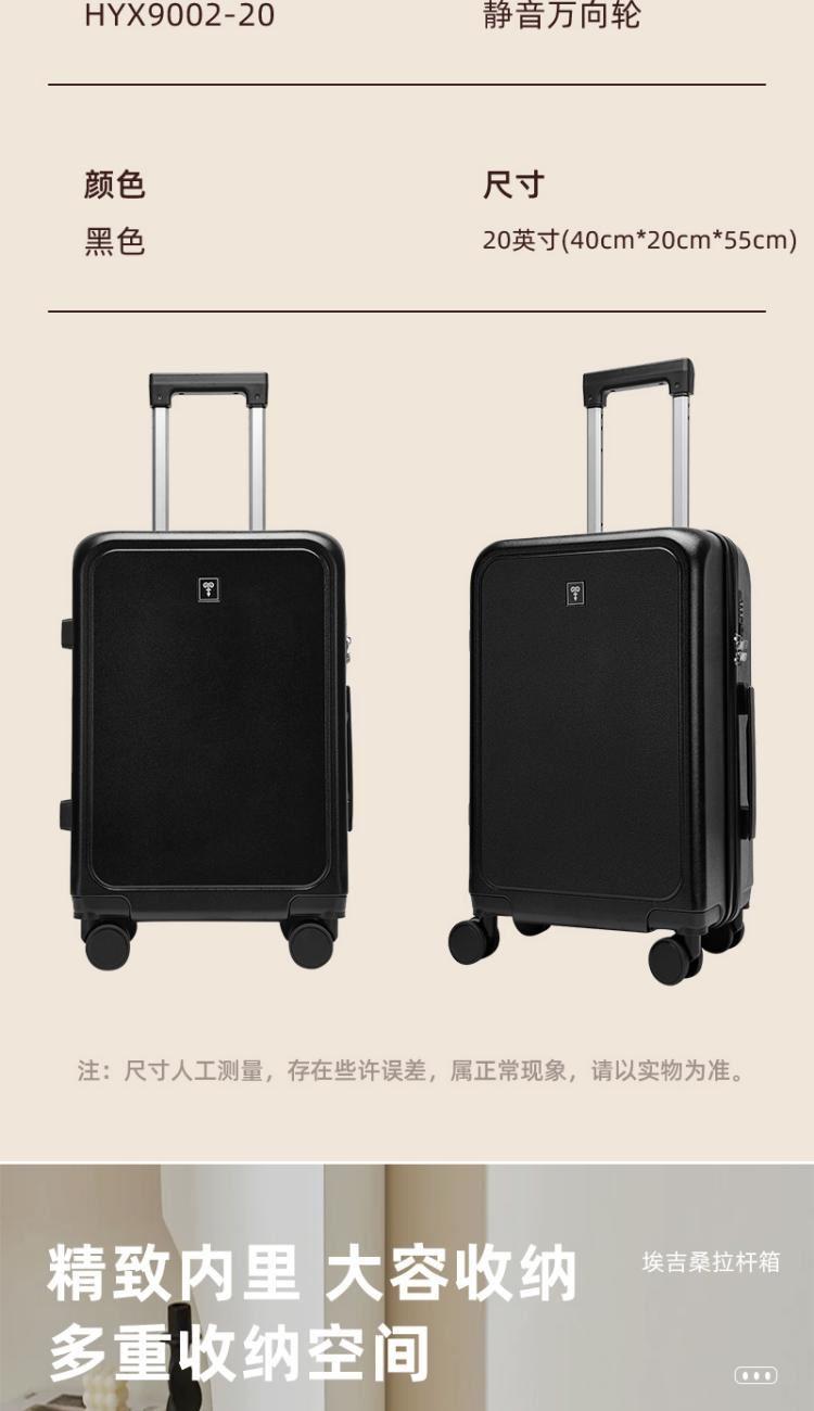 产品型号:HYX9002-20 产品重量:2.65kg 产品规格:20英寸 产品颜色:黑色 产品卖点:德国拜耳PC材质,质地轻盈,高耐热、抗冲击、阻燃、刚硬、柔韧(可踩、摔不变形),犹如护盾般保护着箱内物品; 耐用塑胶提手,柔软触感,温柔接触; 360°万向四轮静音轮,32万米负重测试; 优质铝合金加厚航空级抗压拉杆; 通过拉杆震荡、翻滚撞击、负重角轮耐久度、防锈、防水等各项测试。