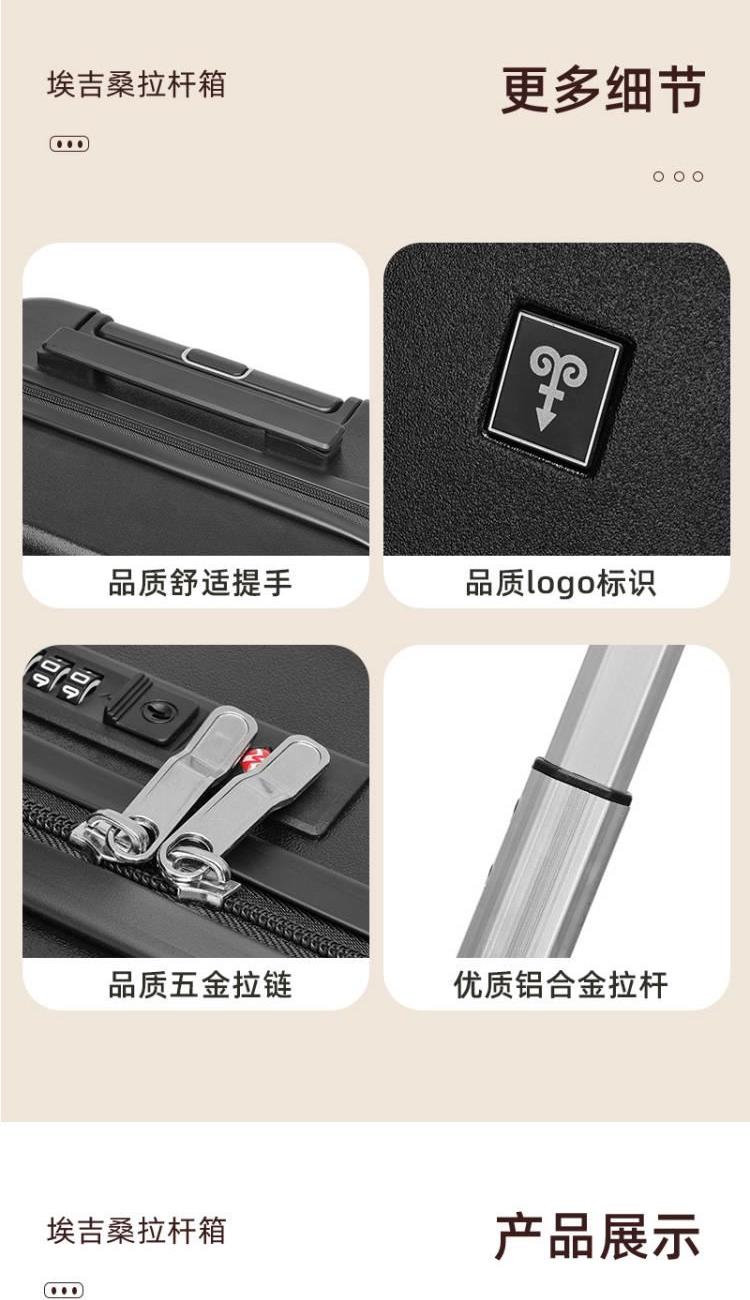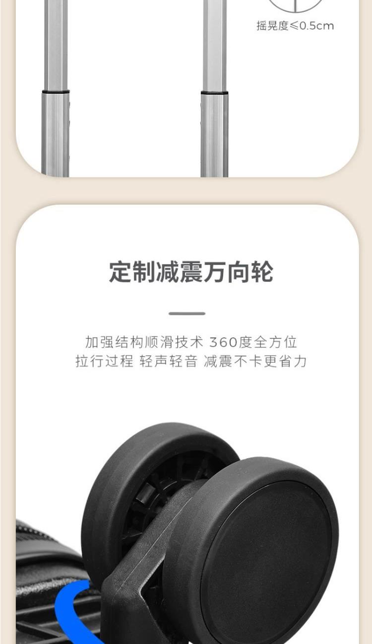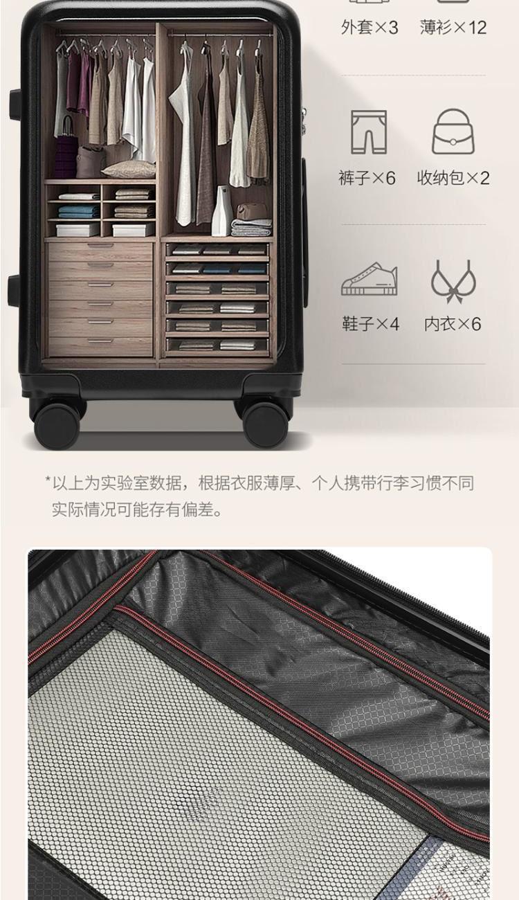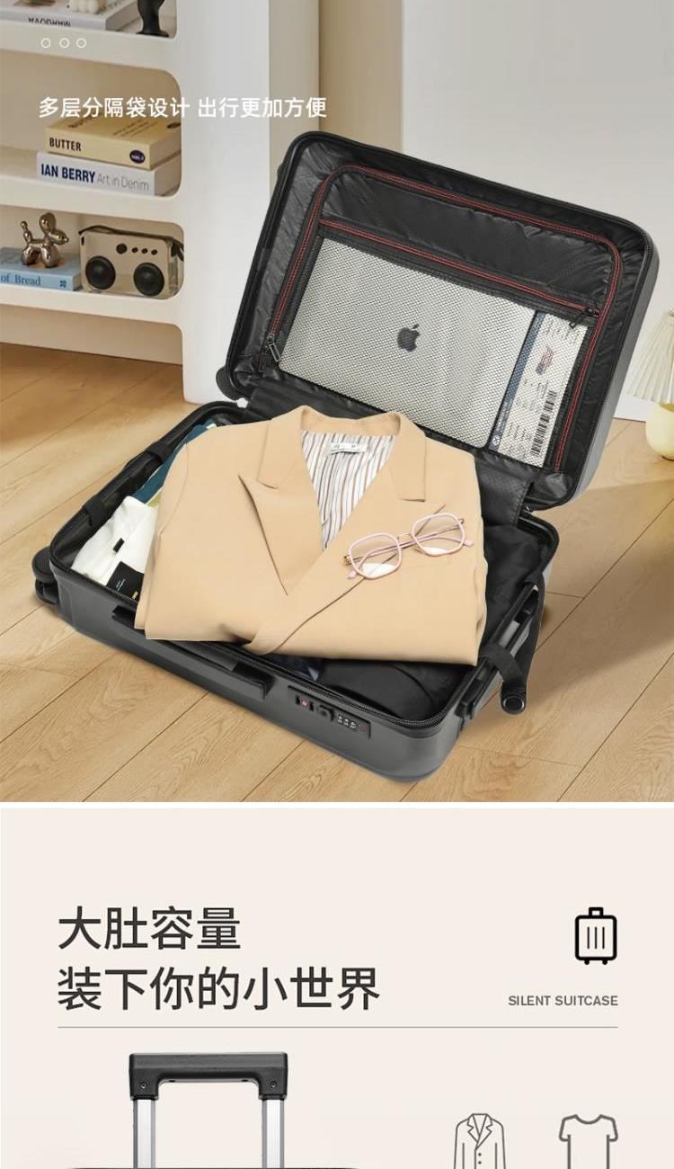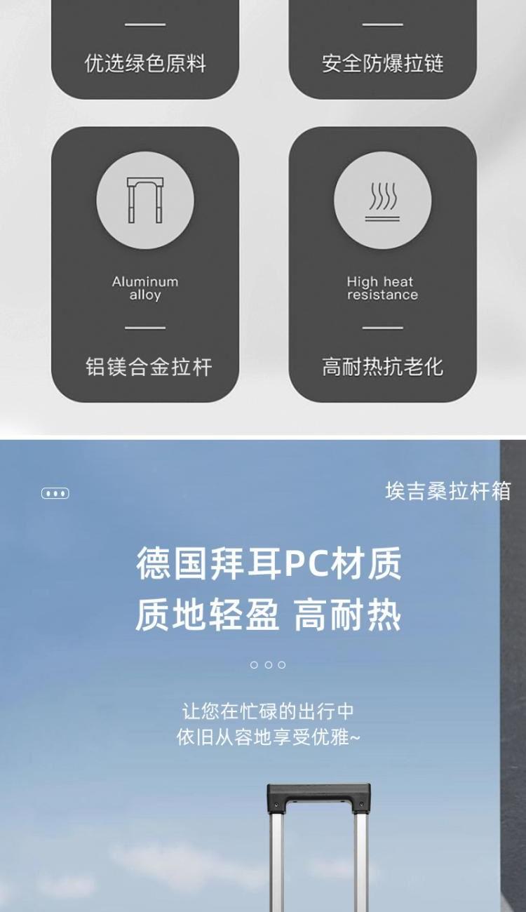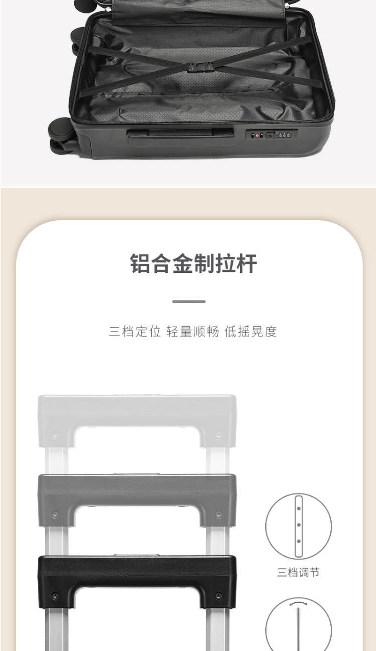 产品型号:HYX9002-20 产品重量:2.65kg 产品规格:20英寸 产品颜色:黑色 产品卖点:德国拜耳PC材质,质地轻盈,高耐热、抗冲击、阻燃、刚硬、柔韧(可踩、摔不变形),犹如护盾般保护着箱内物品; 耐用塑胶提手,柔软触感,温柔接触; 360°万向四轮静音轮,32万米负重测试; 优质铝合金加厚航空级抗压拉杆; 通过拉杆震荡、翻滚撞击、负重角轮耐久度、防锈、防水等各项测试。