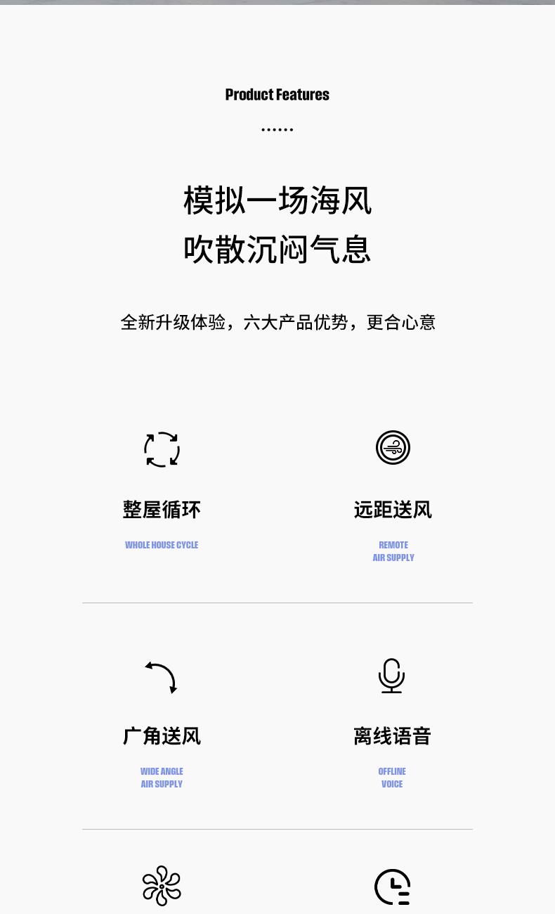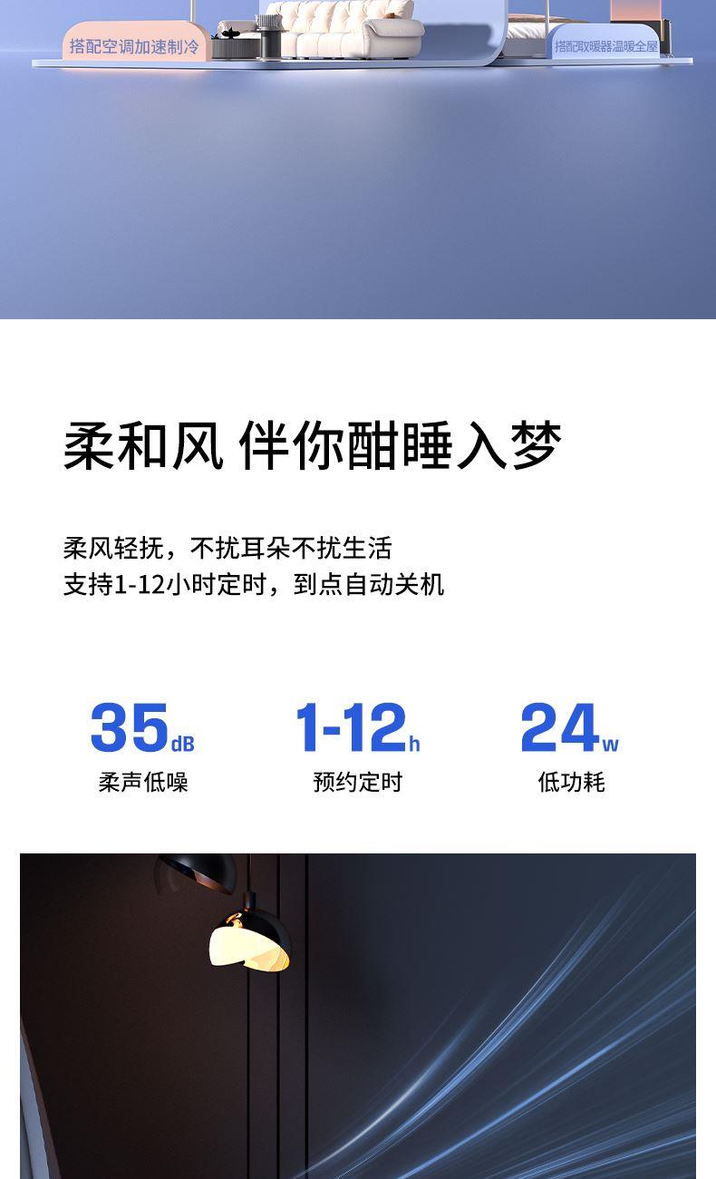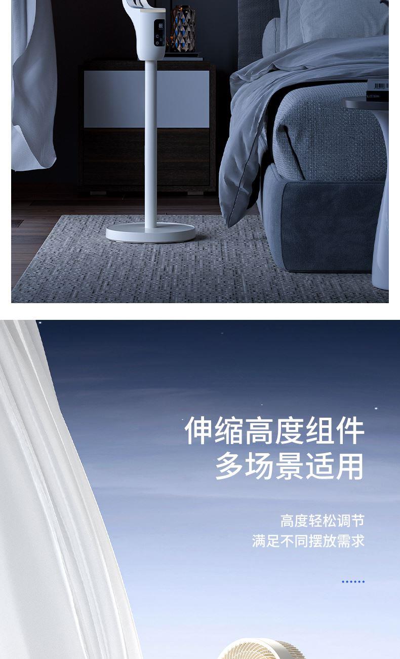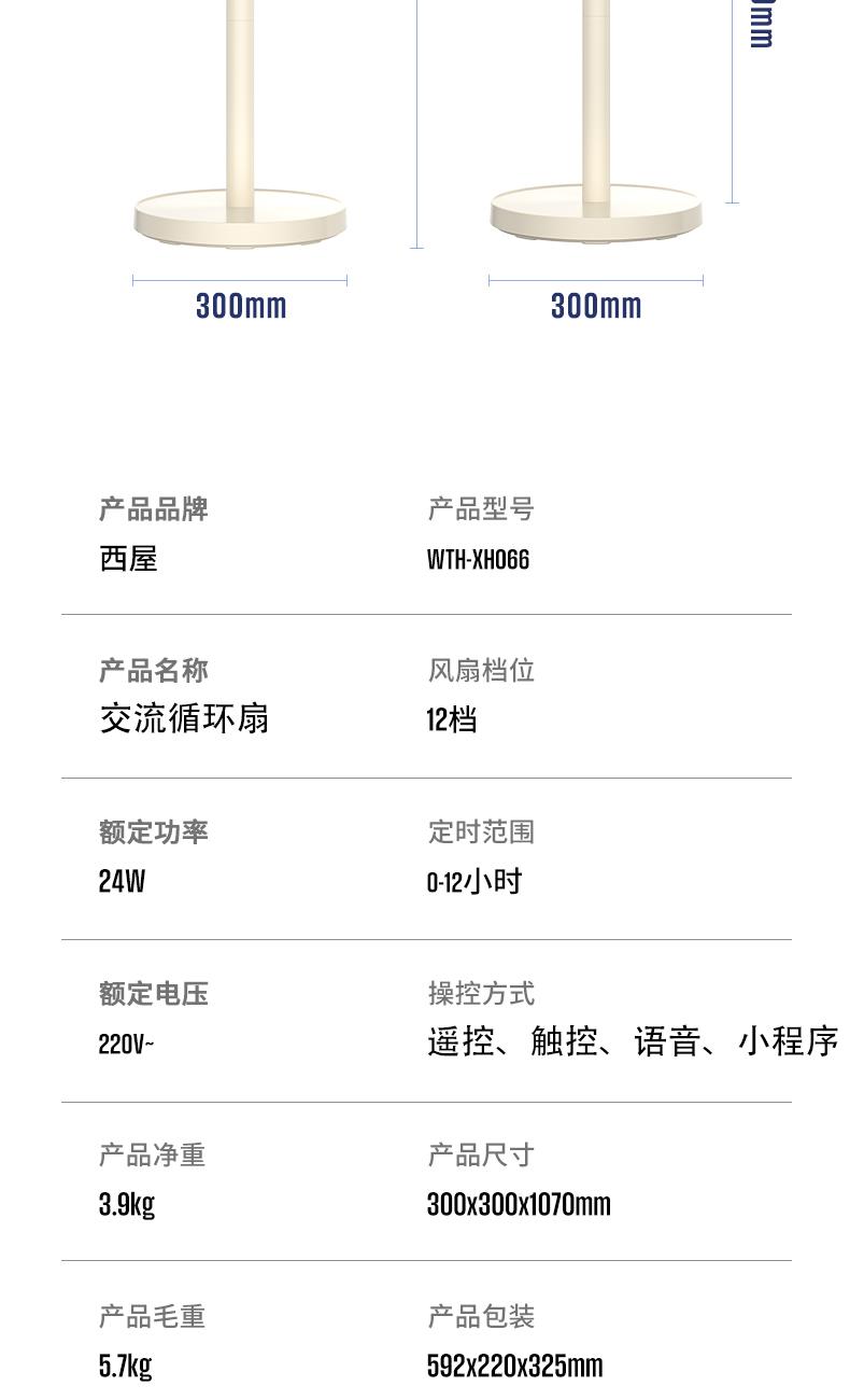 额定功率:35W 定时范围:12小时 档位:12档调节 控制方式:触控、遥控、语音、手机小程序 净重/毛重:4.4kg/5.4kg 产品尺寸:300*300*1070mm 1、12档风速调节,12小时预约定时,AI智能变频; 2、全自动3D遥头,上下90°,左右65°广域送风; 3、多种控制方式:触摸、遥控、小程序、AI智能语音交互; 4、自带记忆功能,隐藏式香熏盒,香随风远; 5、AI智能风,生态负离子净化,循环微气候; 6、高度可伸缩,台、立两用,满足不同摆放需求。