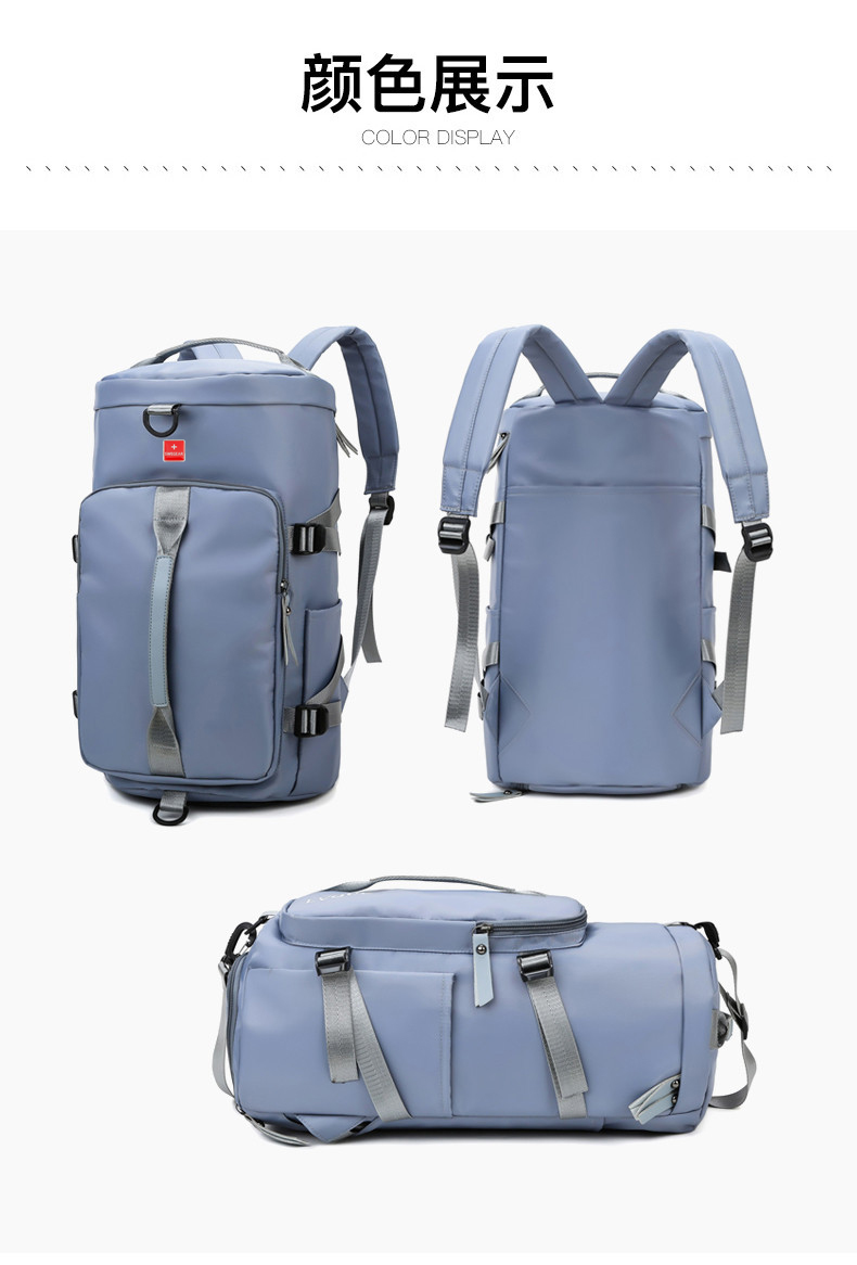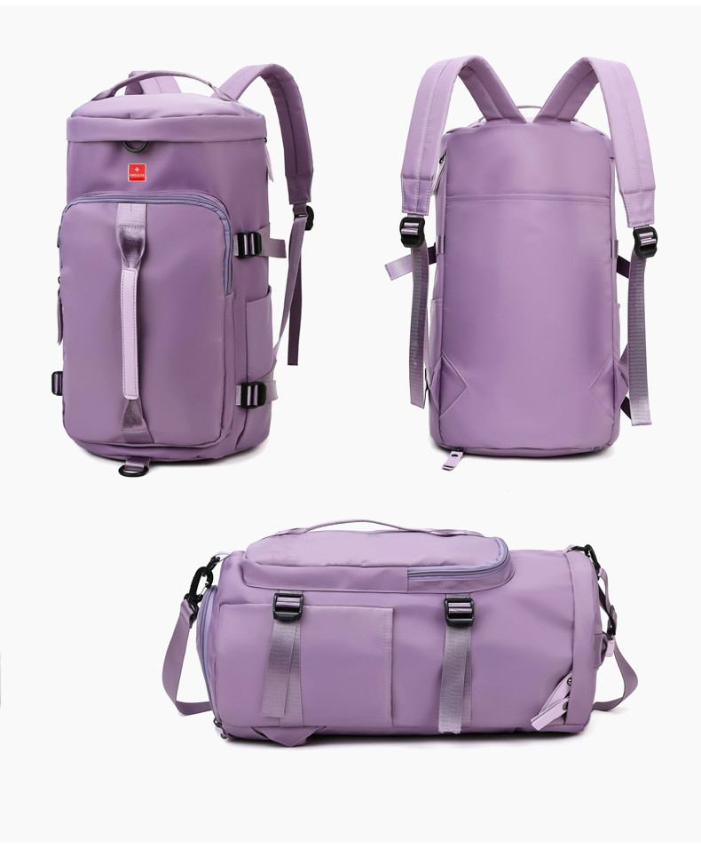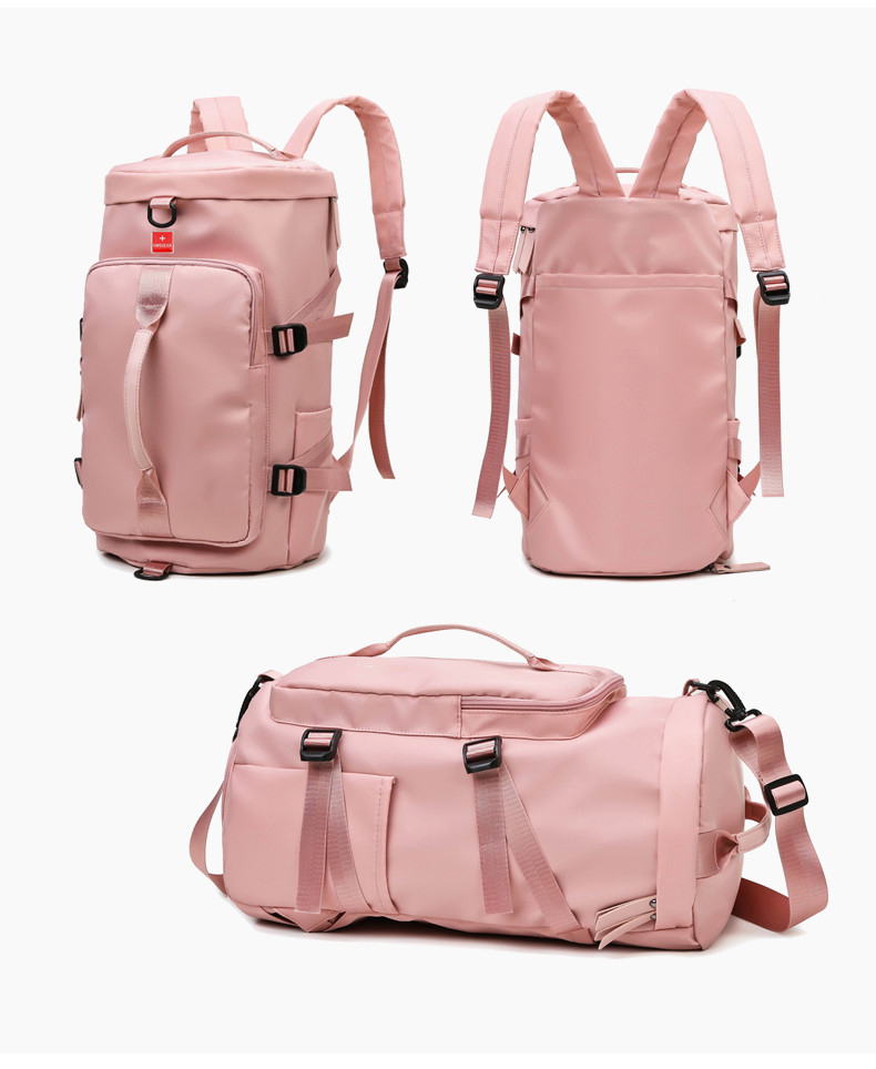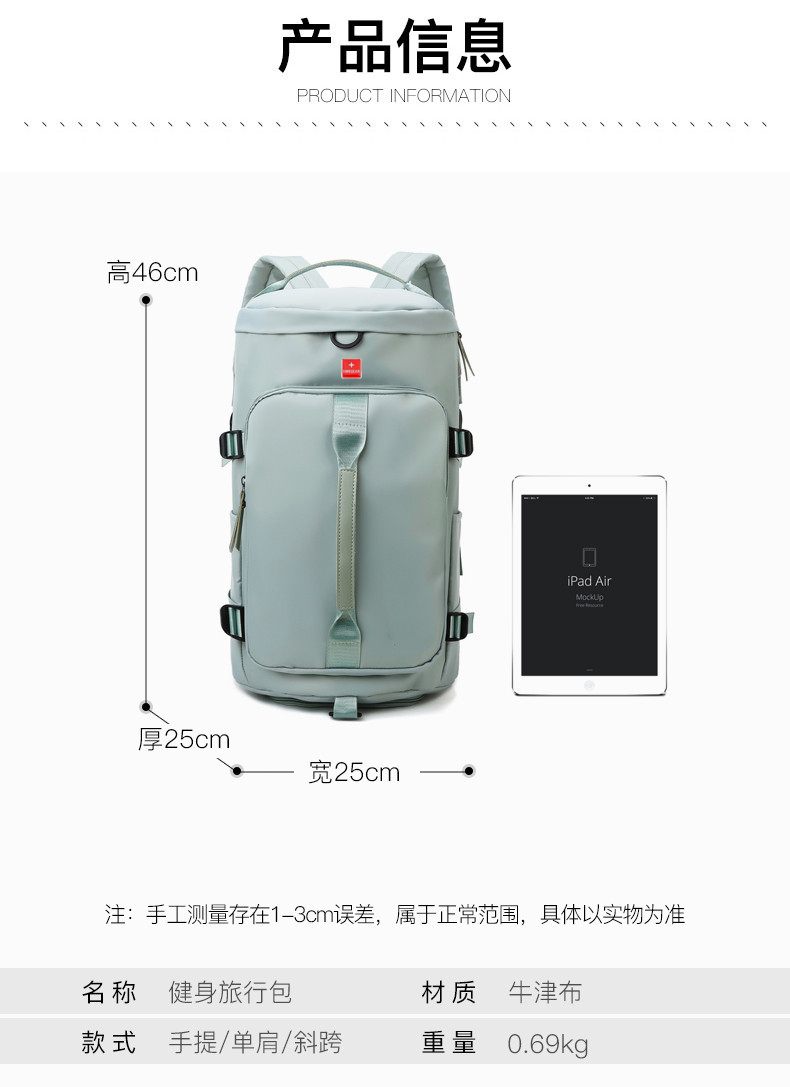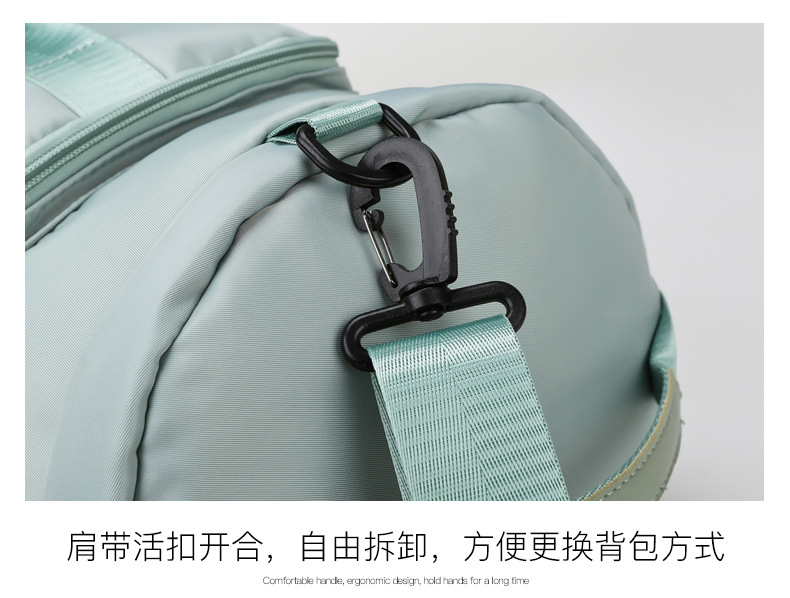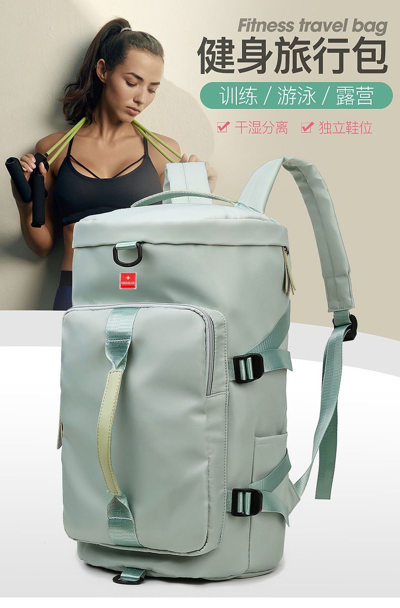 货号: 8810 规格:46*25*25cm 颜色:粉色/蓝色/果绿色/黑色/紫色 ★主面料 牛津布泼水面料 ★可背、可提两用设计 ★采用高品质扣具,能承受各种恶劣外部环境的考验 ★内部干湿分离设计,方便您的运动健身 ★方便的前袋设计,可方便的放置一些小物品 ★可调节长度背带,适合各类身材人群,让您的旅途无忧,同时不失时尚 ★内部大容量空间,鞋子专用存储仓
