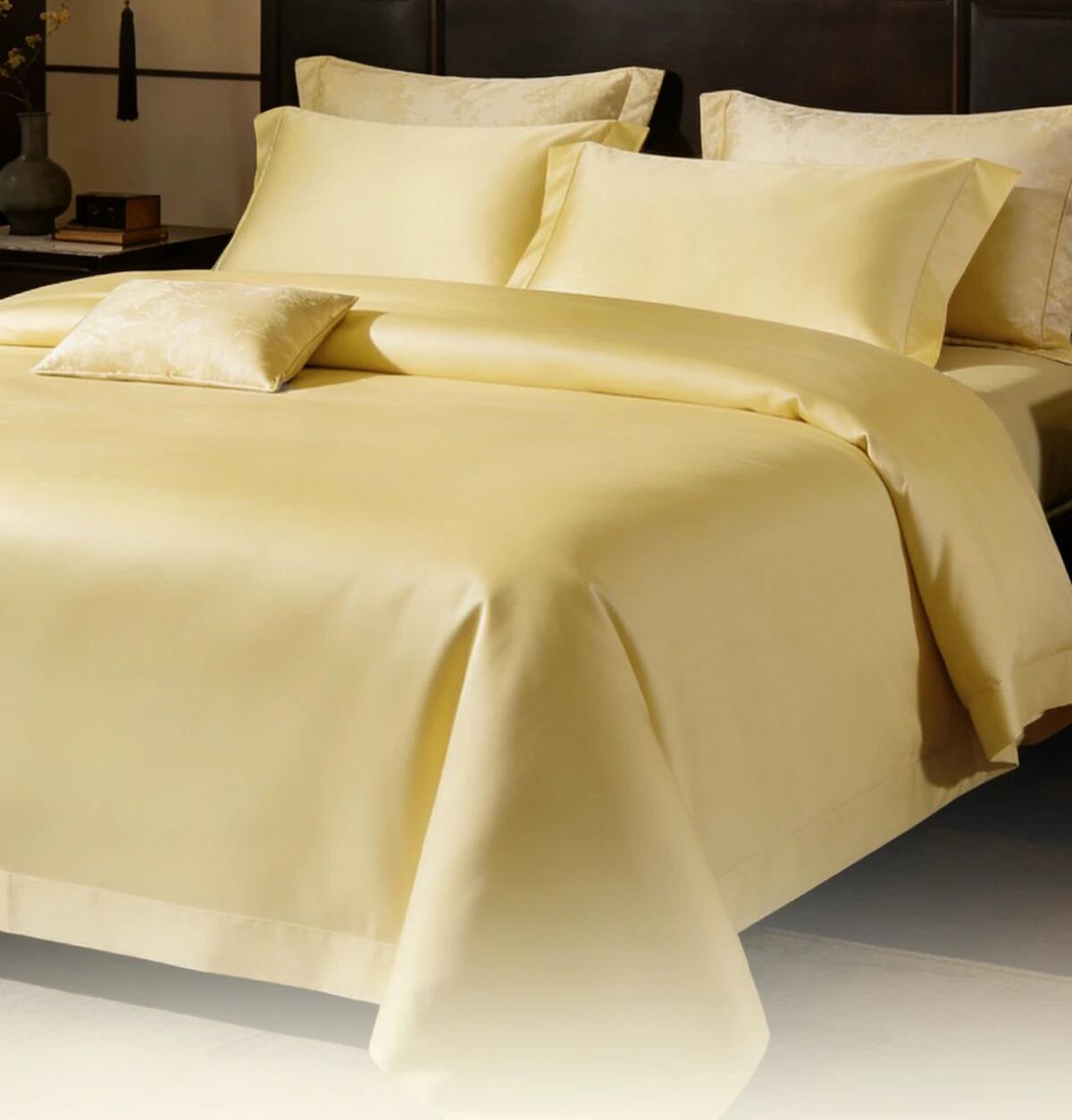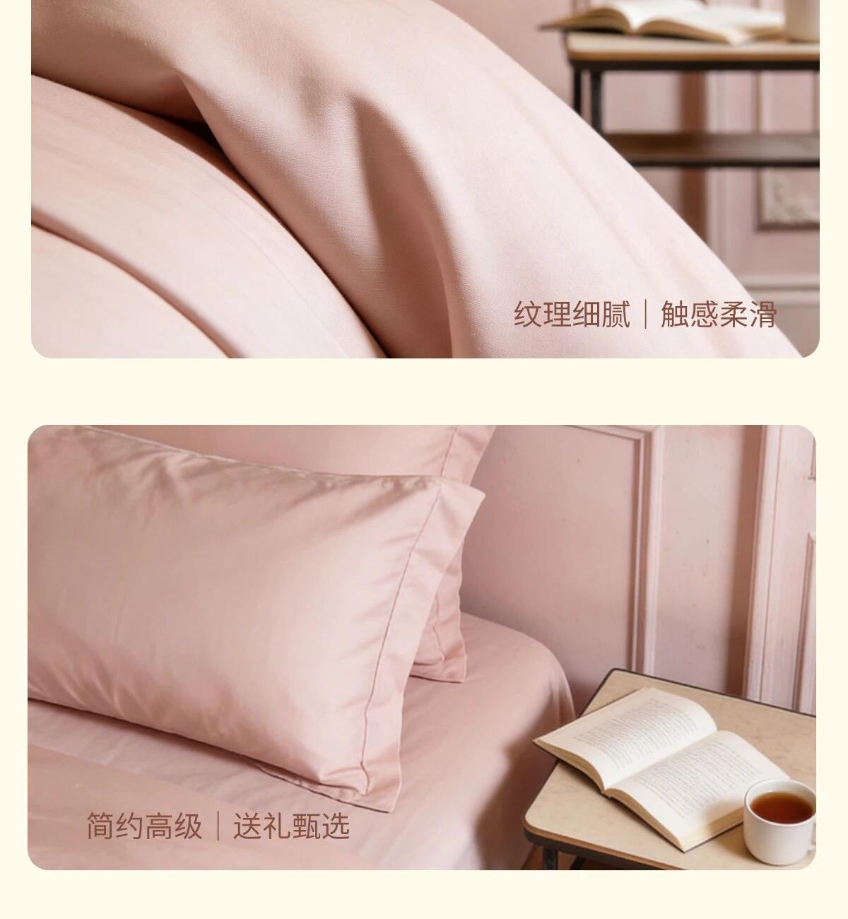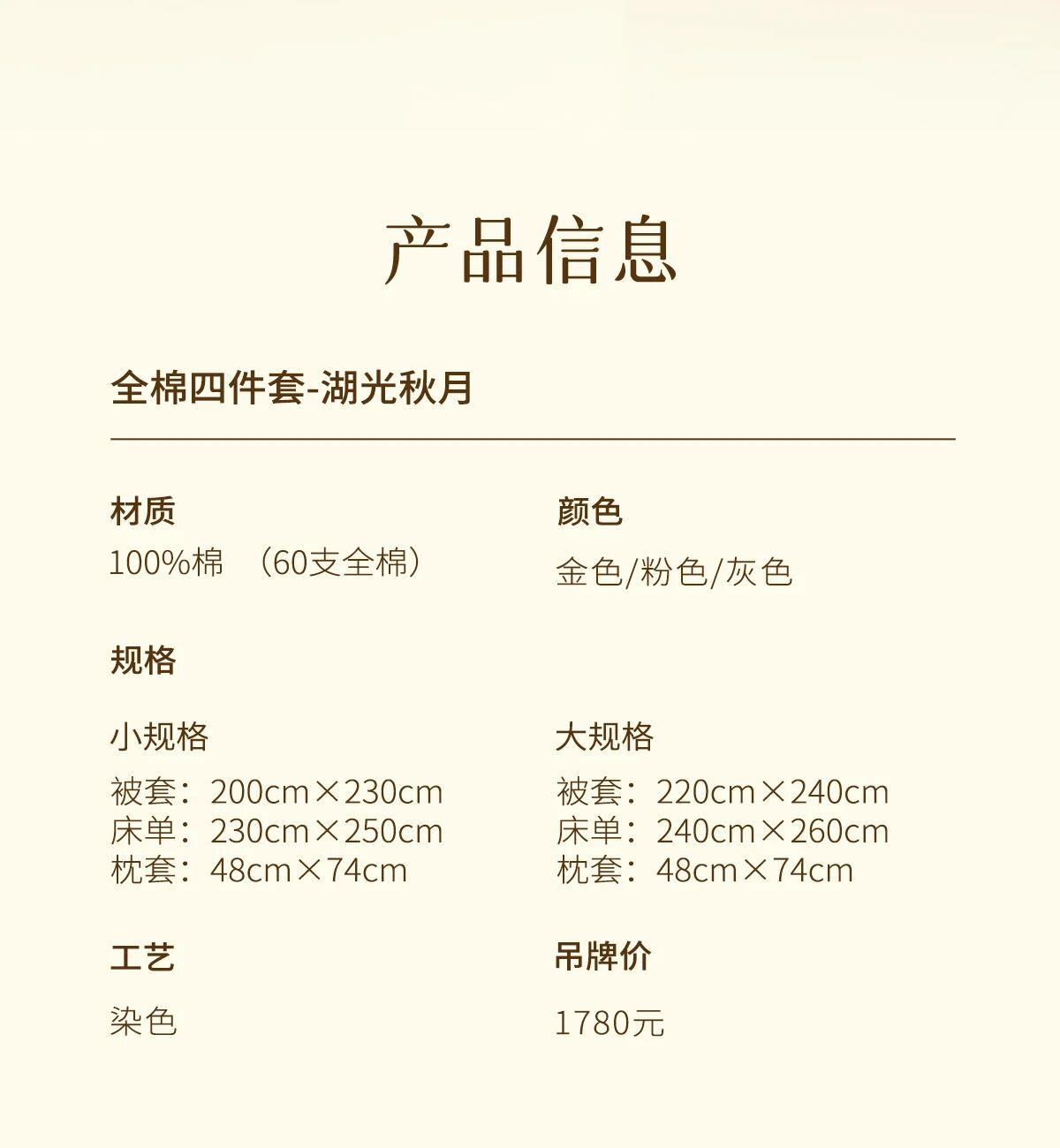 材质:100棉(60支全棉) 颜色:金色/粉色/灰色 工艺:染色 规格: 小规格: 被套:200cmX230cm 床单:230cm×250cm 枕套:48cm×74cm 大规格: 被套:220cm×240cm 床单:240cm×260cm 枕套:48cm×74cm