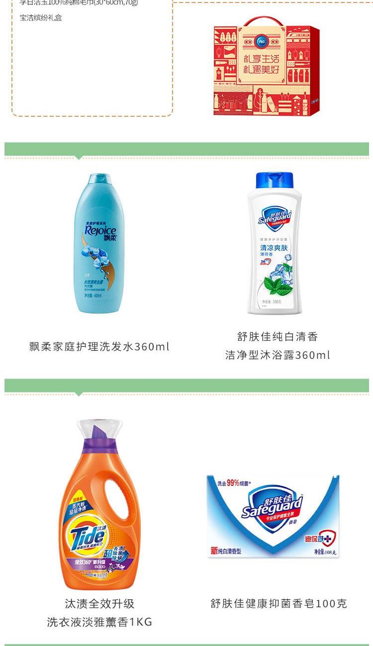 飘柔家庭护理洗发水360ml 舒肤佳纯白清香洁净型沐浴露360ml 舒肤佳健康香皂100克 汰渍全效升级洗衣液淡雅薰香1KG 孚日洁玉纯棉毛巾(30*60cm,70g) 宝洁缤纷礼盒