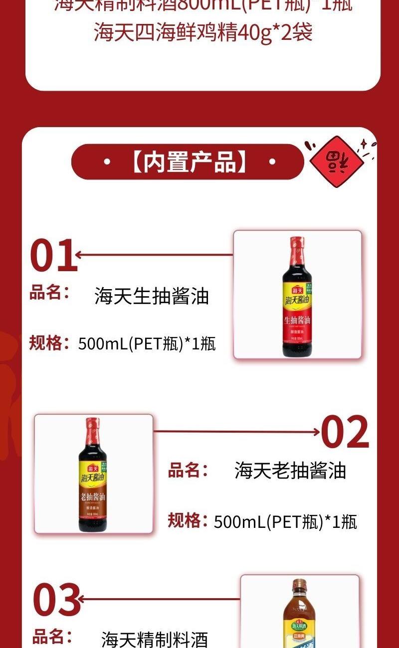 配置: 海天生抽酱油500mL(PET瓶)*1瓶 海天老抽酱油500mL(PET瓶)*1瓶 海天精制料酒800mL(PET瓶)*1瓶 海天四海鲜鸡精40g*2袋 卖点: 可选产品丰富多样,礼箱随心组合,多种价位因需而定,充分满足各种送礼需求,是商务送礼、单位福利的用心之选。