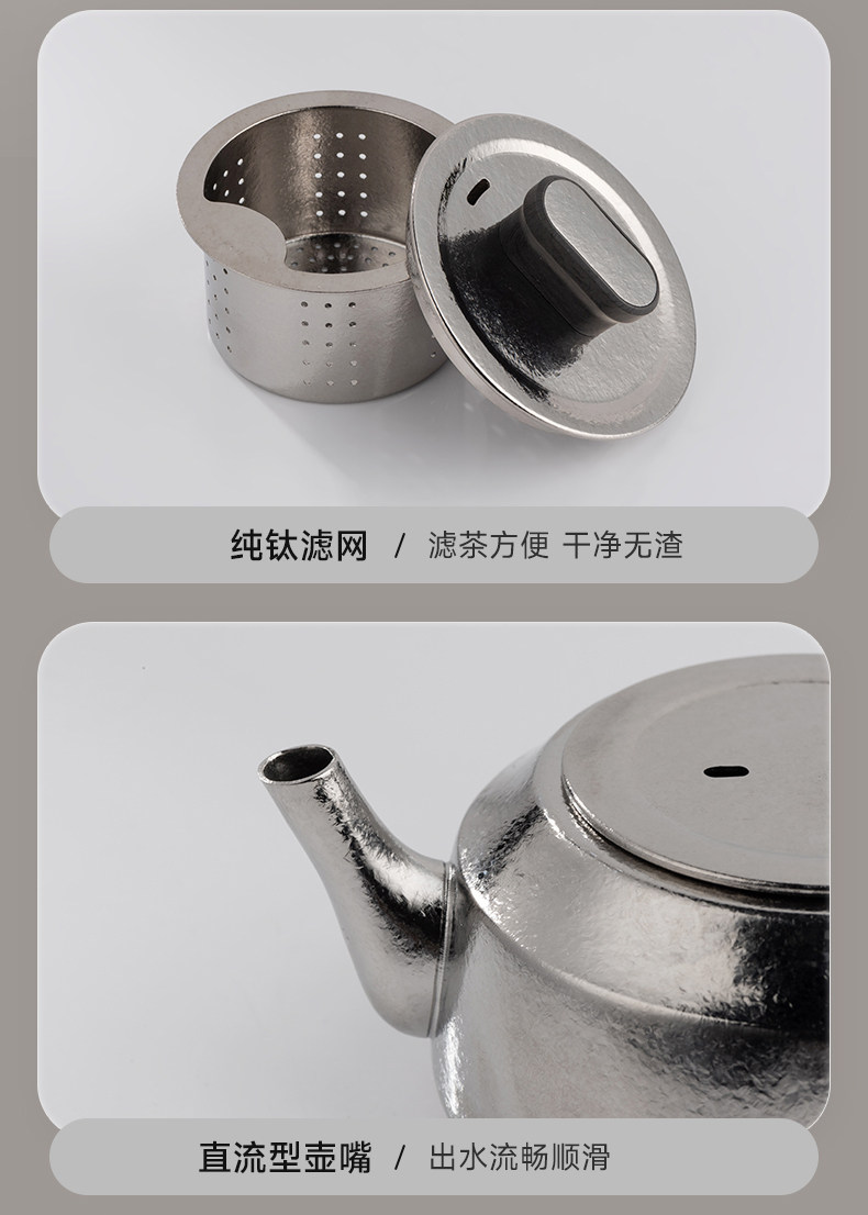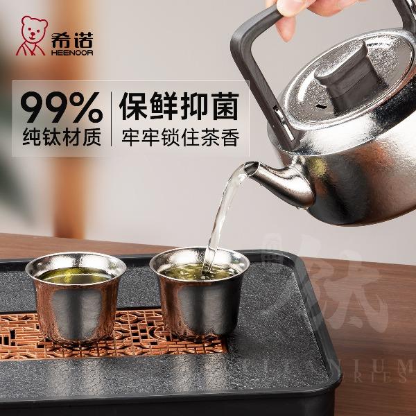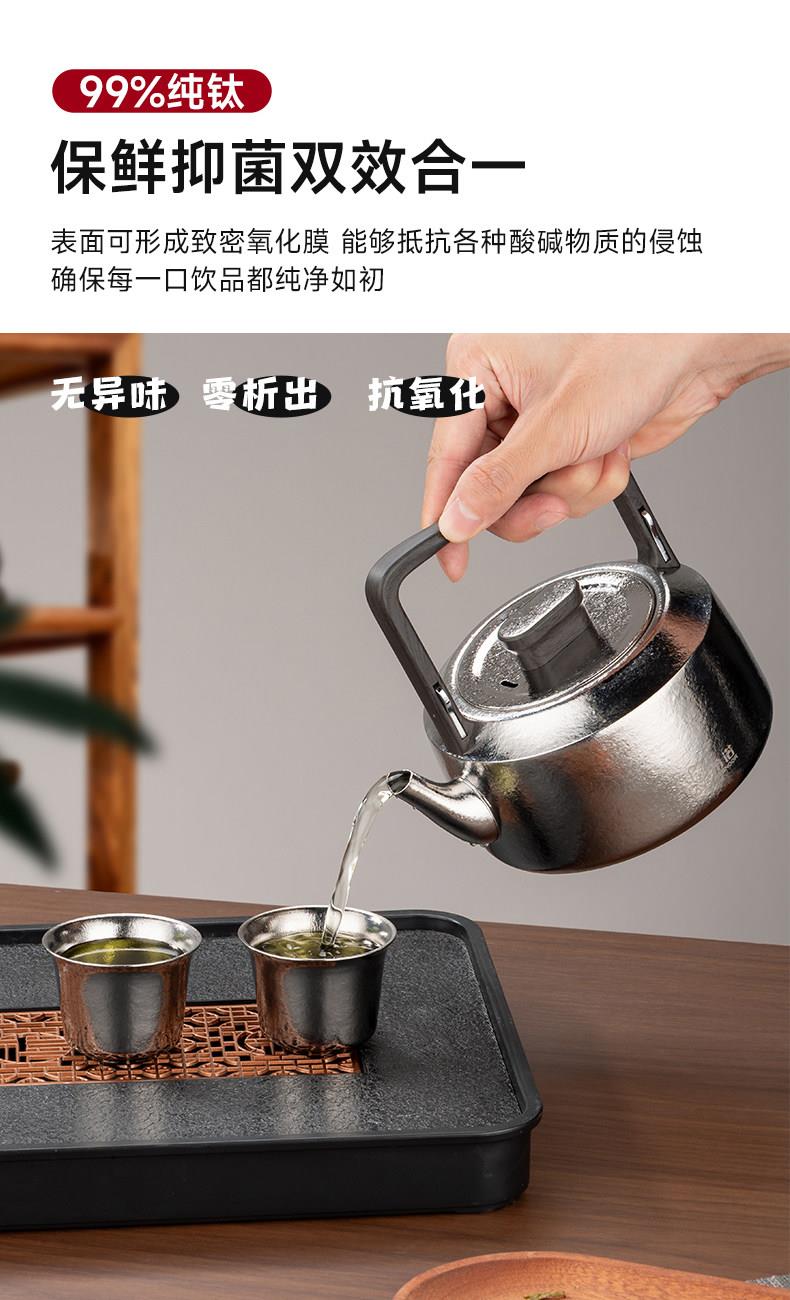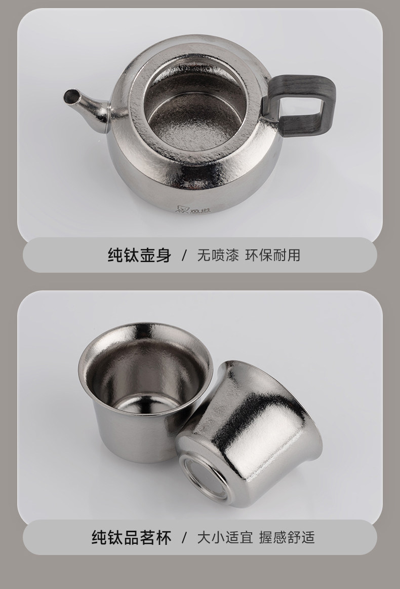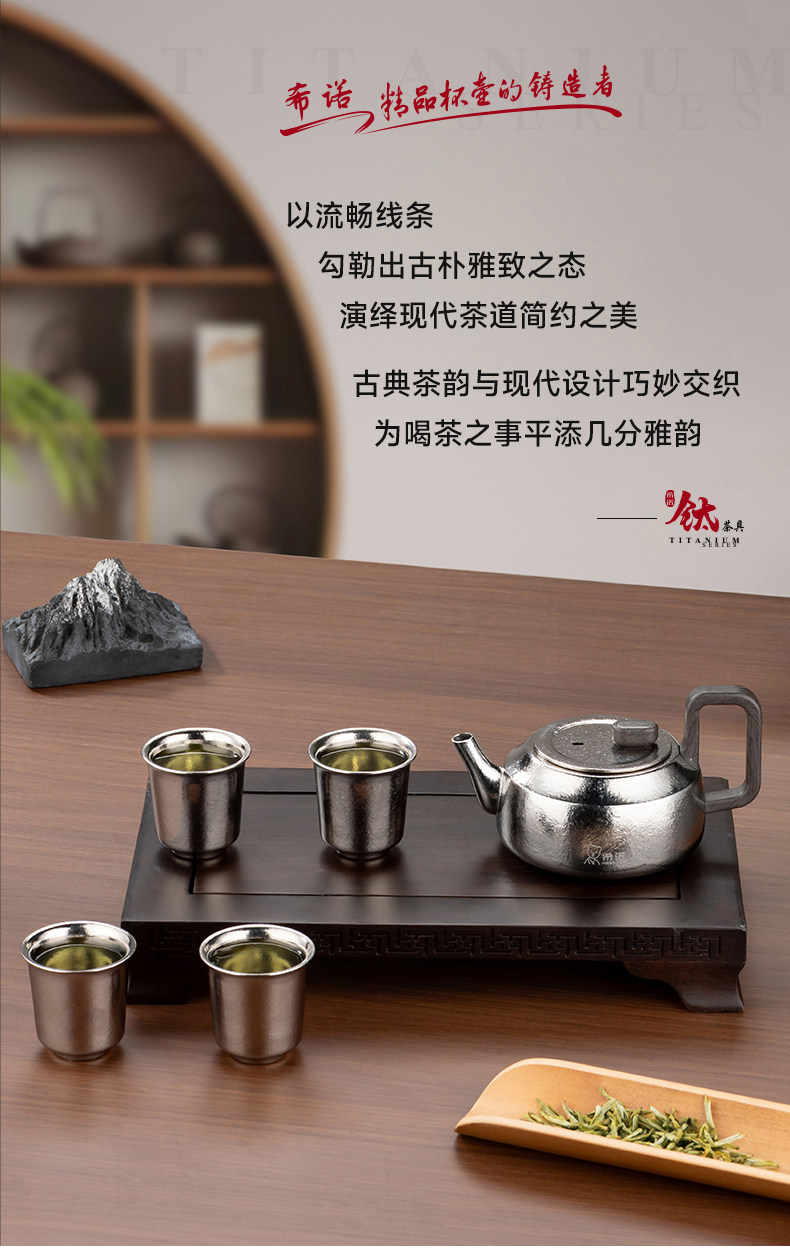 材质: 内胆-钛/杯身-钛 颜色:云海雾凇 套组明细:乾坤壶+品茗杯*4 附加组件:茶漏 容量:乾坤壶T111 210ml/品茗杯T113 30ml