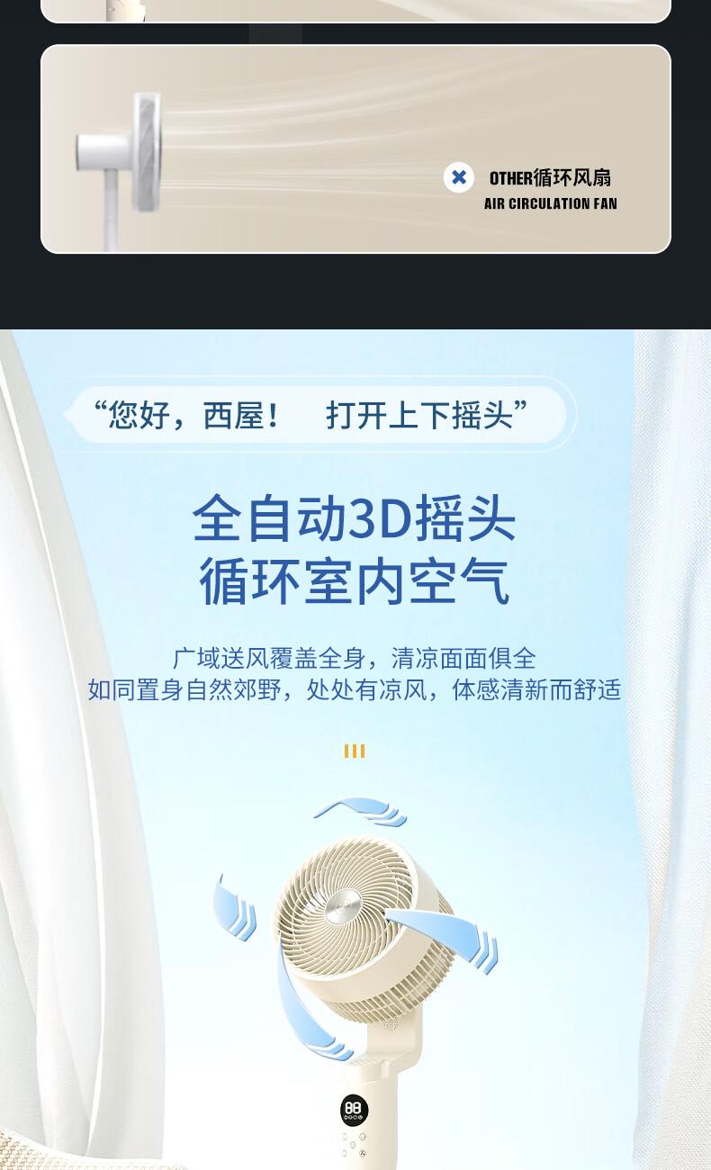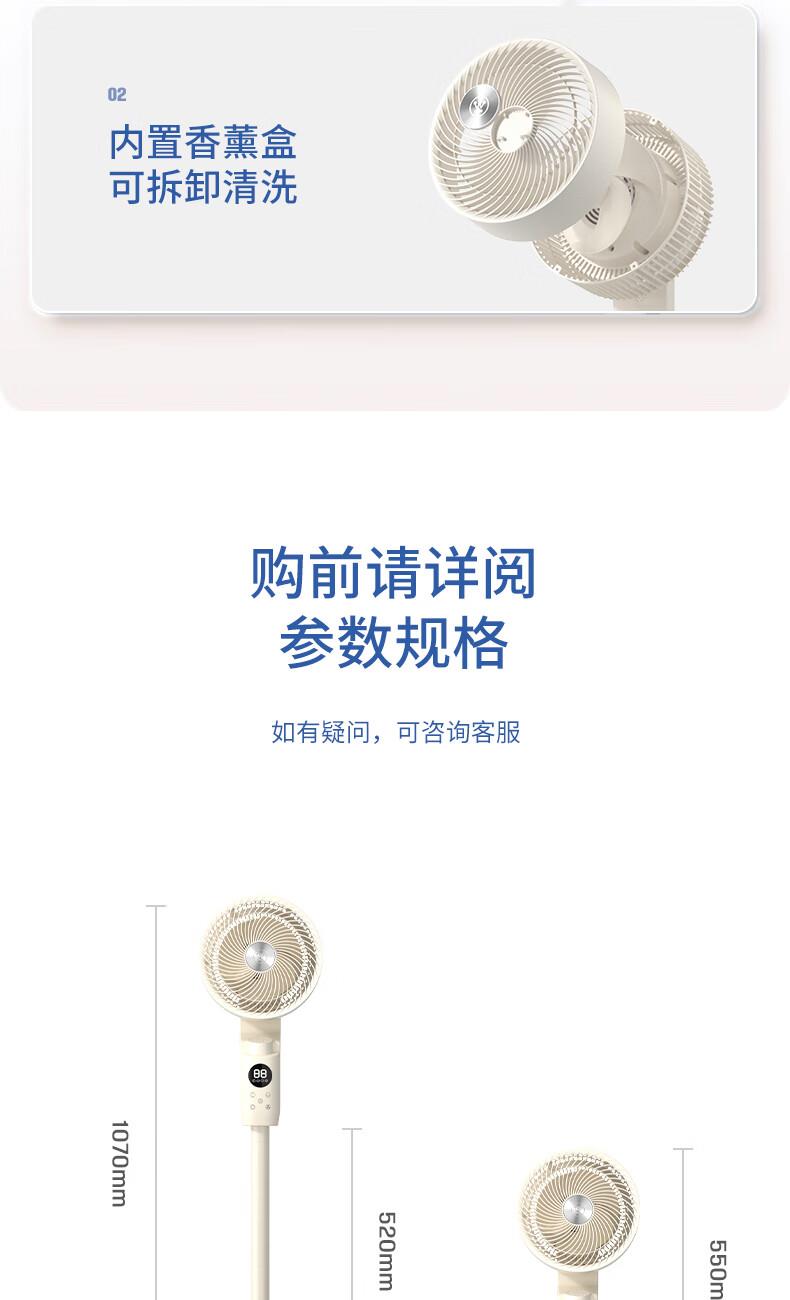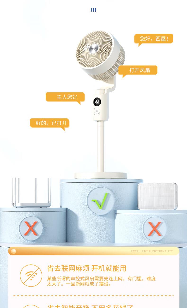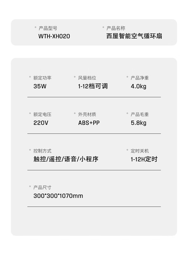 型号:WTH-XH020 功率:35W 控制方式:智慧语音/触屏/遥控/手机小程序 风速档位:12档 产品尺寸:300*300*1098mm 12档风速调节; 智能语音交互; 3D摇头送风 12h预约定时 台立两用 内置香薰盒