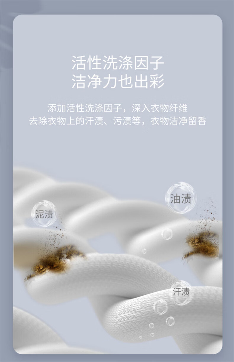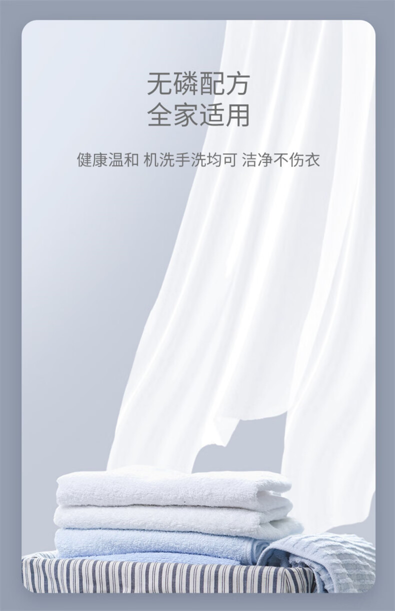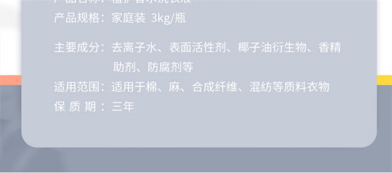 销售规格:3kg/瓶*1瓶 外包装方式:纸箱包装 主要成分:去离子水、表面活性剂、椰子油衍生物、香精助剂、防腐剂等 保质期:3年 1.除螨,去渍柔护; 2.低泡易漂,省心洁净; 3.无磷配方,全家适用; 4.添加活性因子,洁净出彩; 5.瑞士进口香氛,散发优雅奢香; 6.微胶囊留香技术,香味绵长持久。