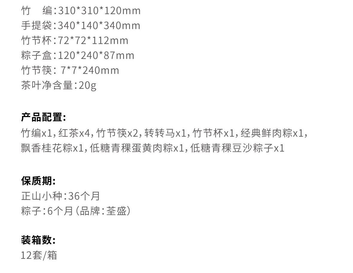 产品尺寸: 竹 编:310*310*120mm 手提袋:340*140*340mm 竹节杯:72*72*112mm 粽子盒:120*240*87mm 竹节筷:7*7*240mm 茶叶净含量:20g 产品配置: 竹编x1,红茶x4,竹节筷x2,转转马x1,竹节杯x1,经典鲜肉粽x1,飘香桂花粽x1,低糖青稞蛋黄肉粽x1,低糖青稞豆沙粽子x1 保质期: 正山小种:36个月 粽子:6个月