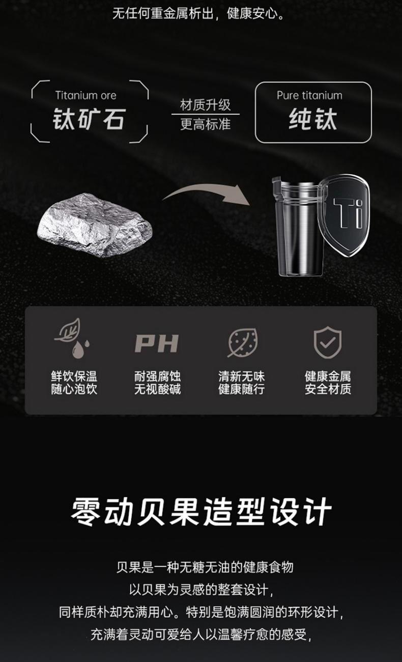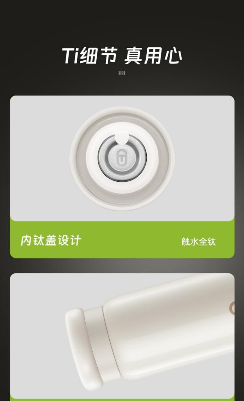 产品型号:RWS42B13Q-TW 产品容量:420ml 彩盒尺寸:72*72*200mm 净重:0.30KG 产品材质:内钛外钢 1、纯钛内胆,泡出健康纯味 2、无重金属析出,无惧高温久泡 3、泡饮无限制,不易留味串味 4、内钛盖设计,触水全钛 5、高真空工艺保温保冷更持久