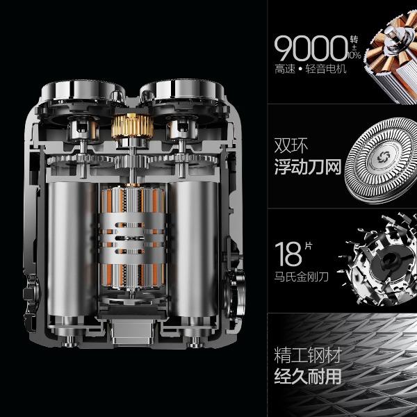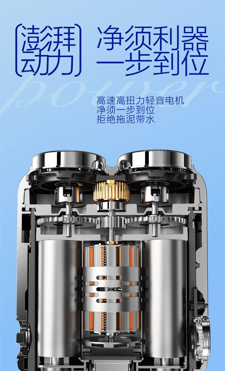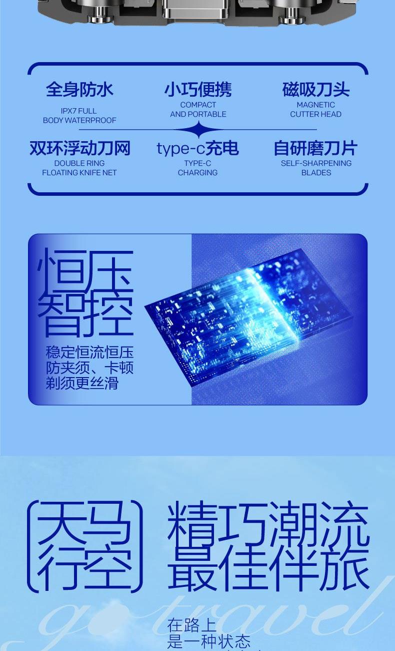 电机转速:9000转/min 刀头材质:精钢 刀头数量:2个 产品尺寸:长53mm;宽28.5mm;高63mm 产品净重:0.1kg 电压:5V 防水等级:IPX7,可全身水洗 充电时间:1小时快充 续航:60天 1、设计轻奢便携,超高颜值; 2、省级双环弧面刀网,3D浮动刀头,智能防夹须; 3、9000转高速静噪电机,够性能才够快; 4、顺滑贴肤,干湿两剃; 5、IPX7级防水等级,可全身水洗;