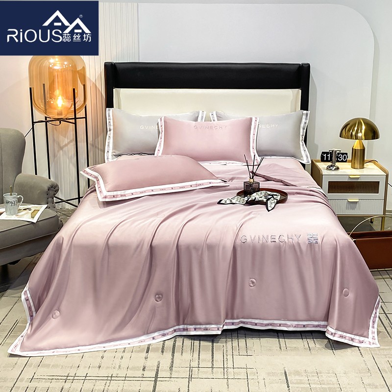 规格: 1.5M/1.8M床 夏被200*230cm 床单245*250cm 枕套48*74cm 面料:冰丝棉/聚酯纤维 花色:极光灰 / 优雅玉 / 香槟金 / 香草绿 / 樱花粉 / 松石绿 选用水洗冰丝面料,手感舒适光泽感强,爽滑舒适,整张羽丝棉填充,不结板蓬松透气,采用定位绗缝,防止跑棉,填充物更加均匀,精美刺绣,搭配宽边印花设计,可水洗机洗,活性印染,色彩靓丽,久用如新。