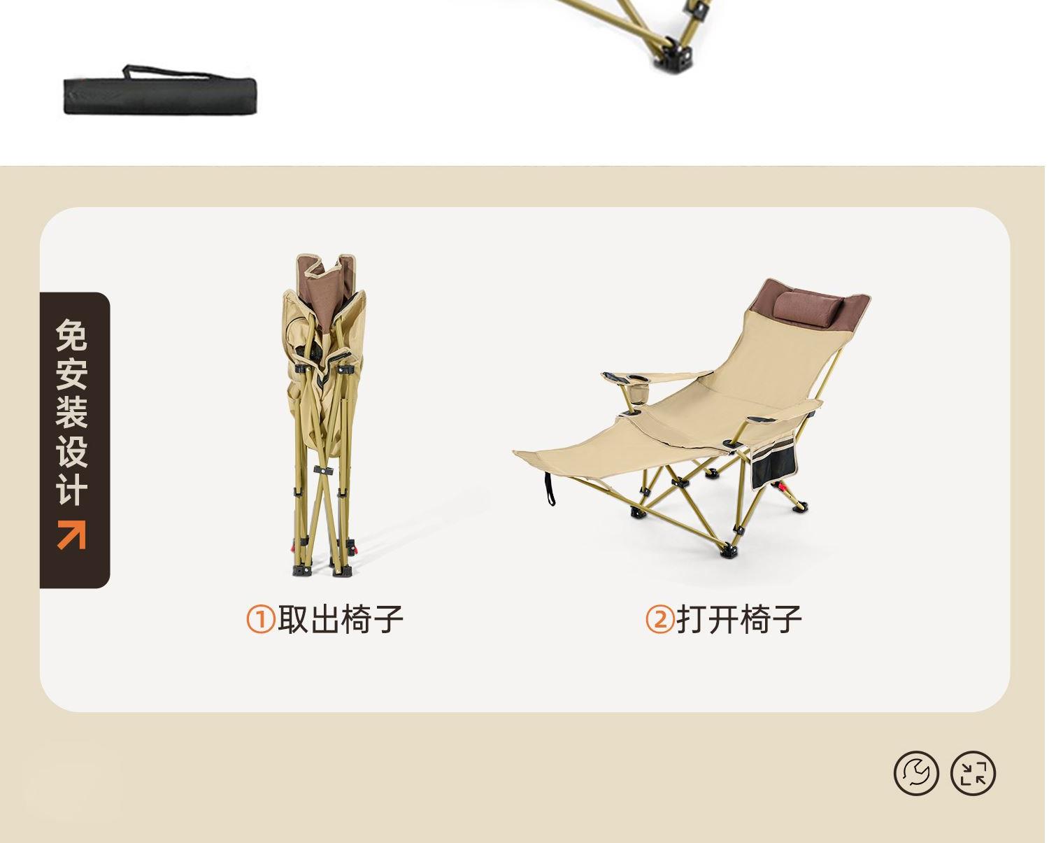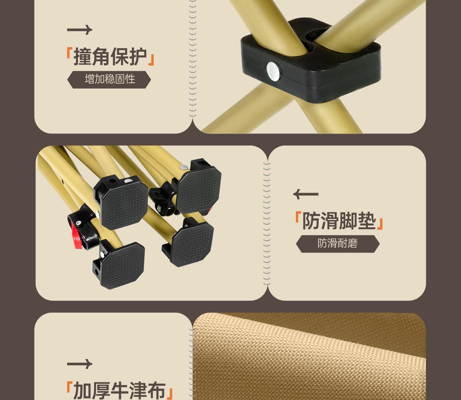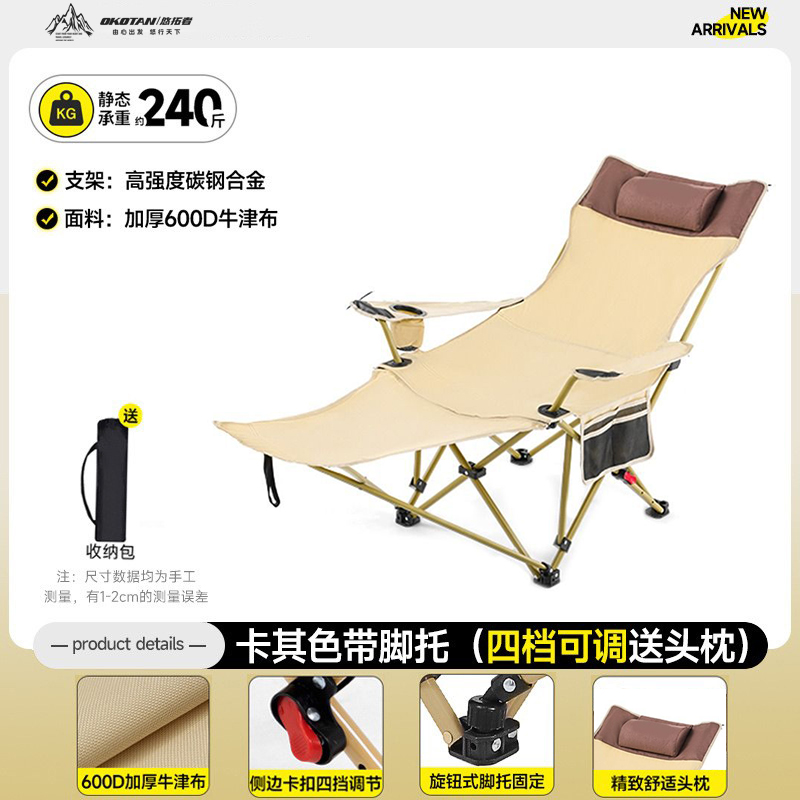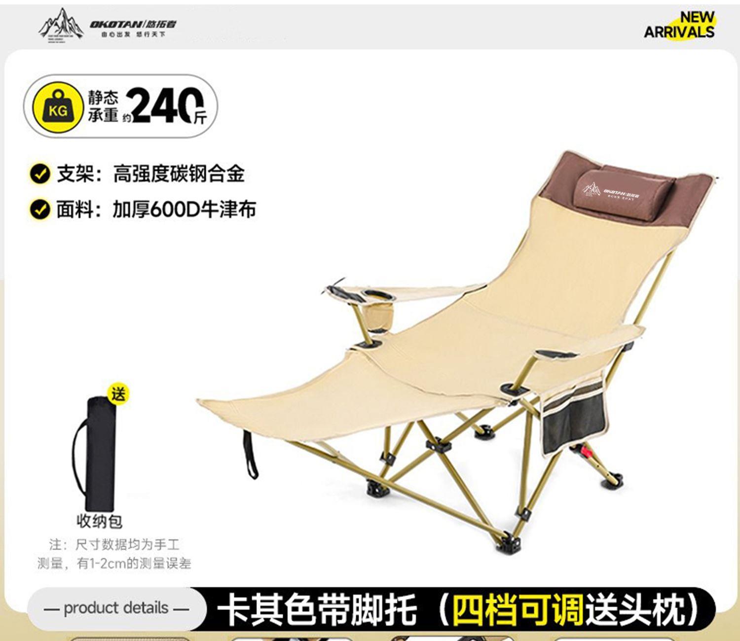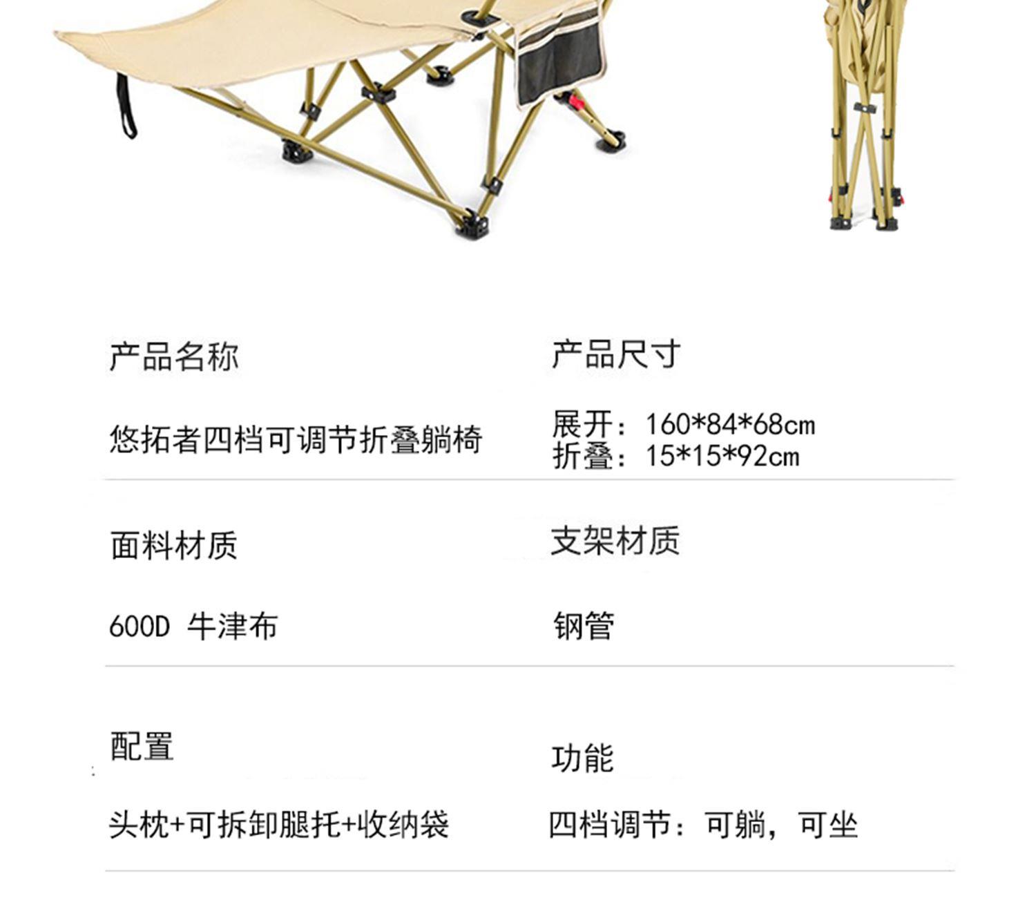 规格:160*68*84cm 材质:牛津布600DPVC层,16MM钢管 颜色:卡其色 产品特点: 便携收纳,可躺可坐,结实承重,耐磨抗撕裂 适用场景:休闲户外,办公午休,住院陪护,美术写生等。