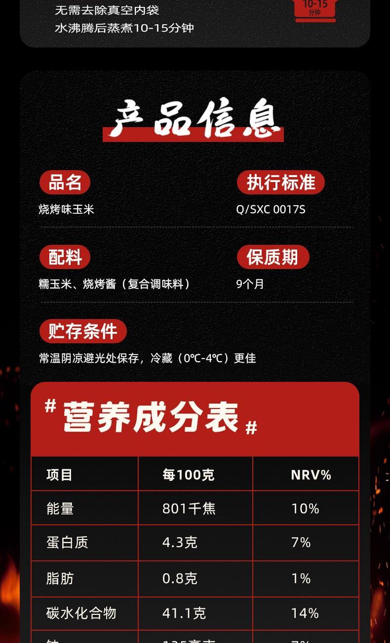 产品信息: ①规格:1kg ②保质期:9个月 ③产地:辽宁省沈阳市 ④特点:鲜香粘糯,玉米与酱汁奇妙搭配,东北烧烤秘制工艺,鲜香入味