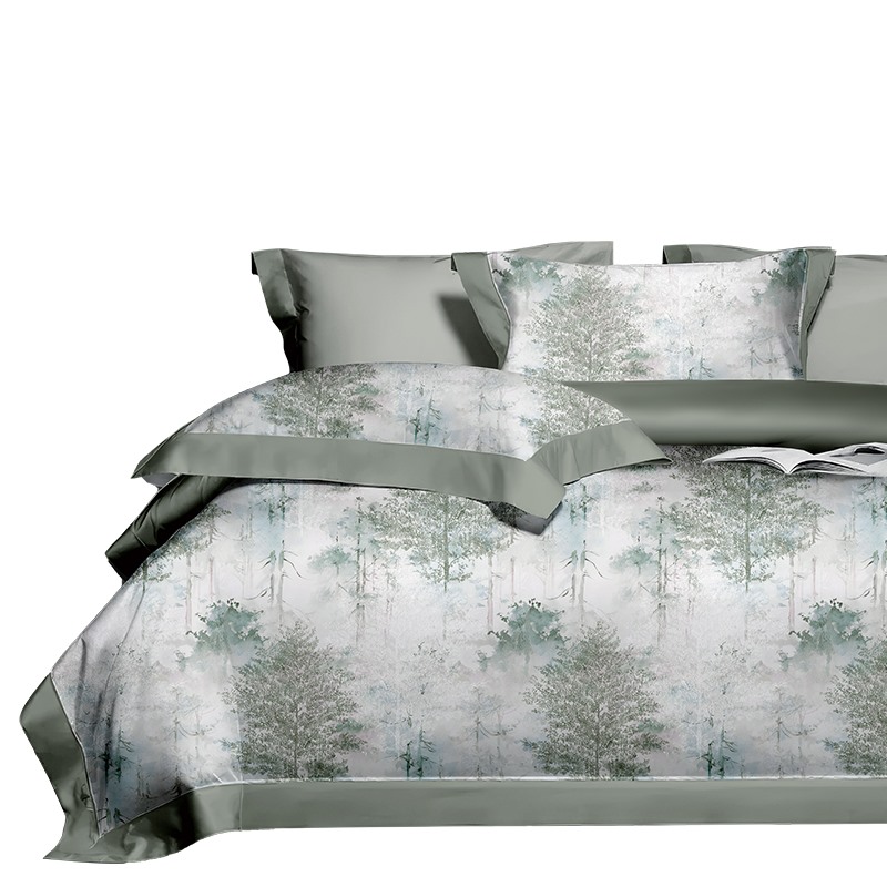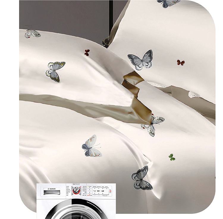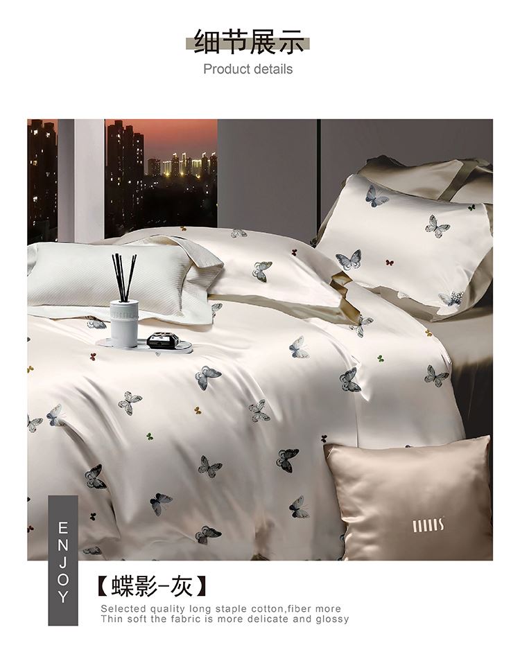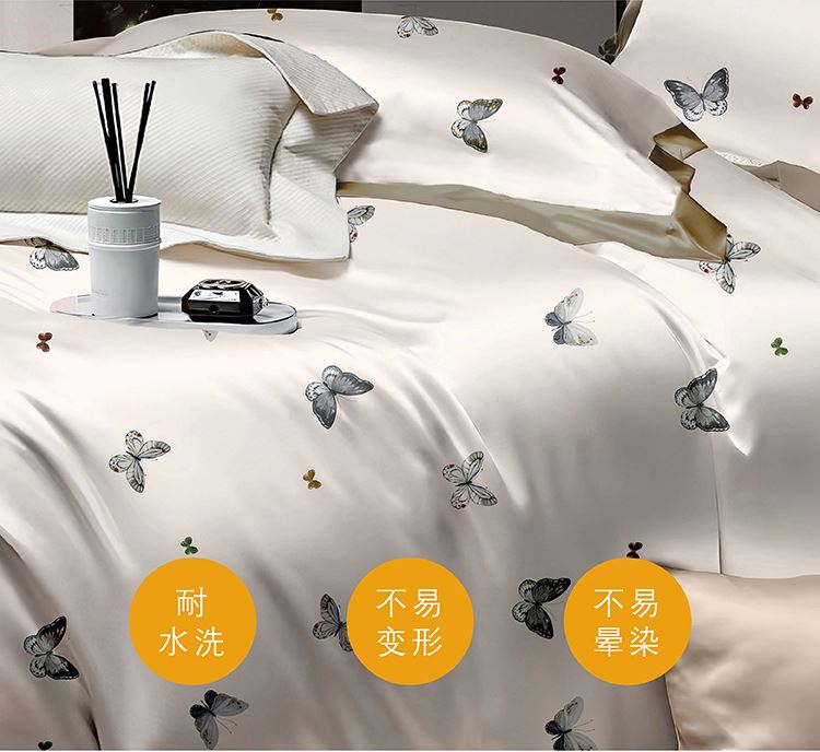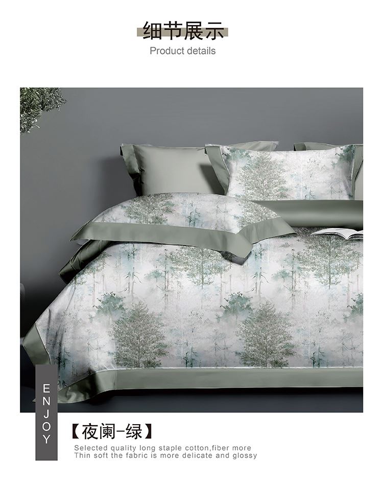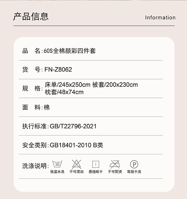 床单:245x250cm 被套:200x230cm 枕套:48x74cm 【面 料】全棉 (60支长绒棉) 产品特点: 1.选用60支高密度全棉面料,手感柔软舒适,透气性能强,四季可用; 2.锁边内缝式被套,圆角贴边床单,做工扎实精细,尽显品质; 3.花型时尚、艳丽、明亮,数码印染,色牢度高,安全。