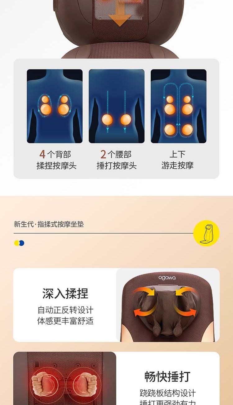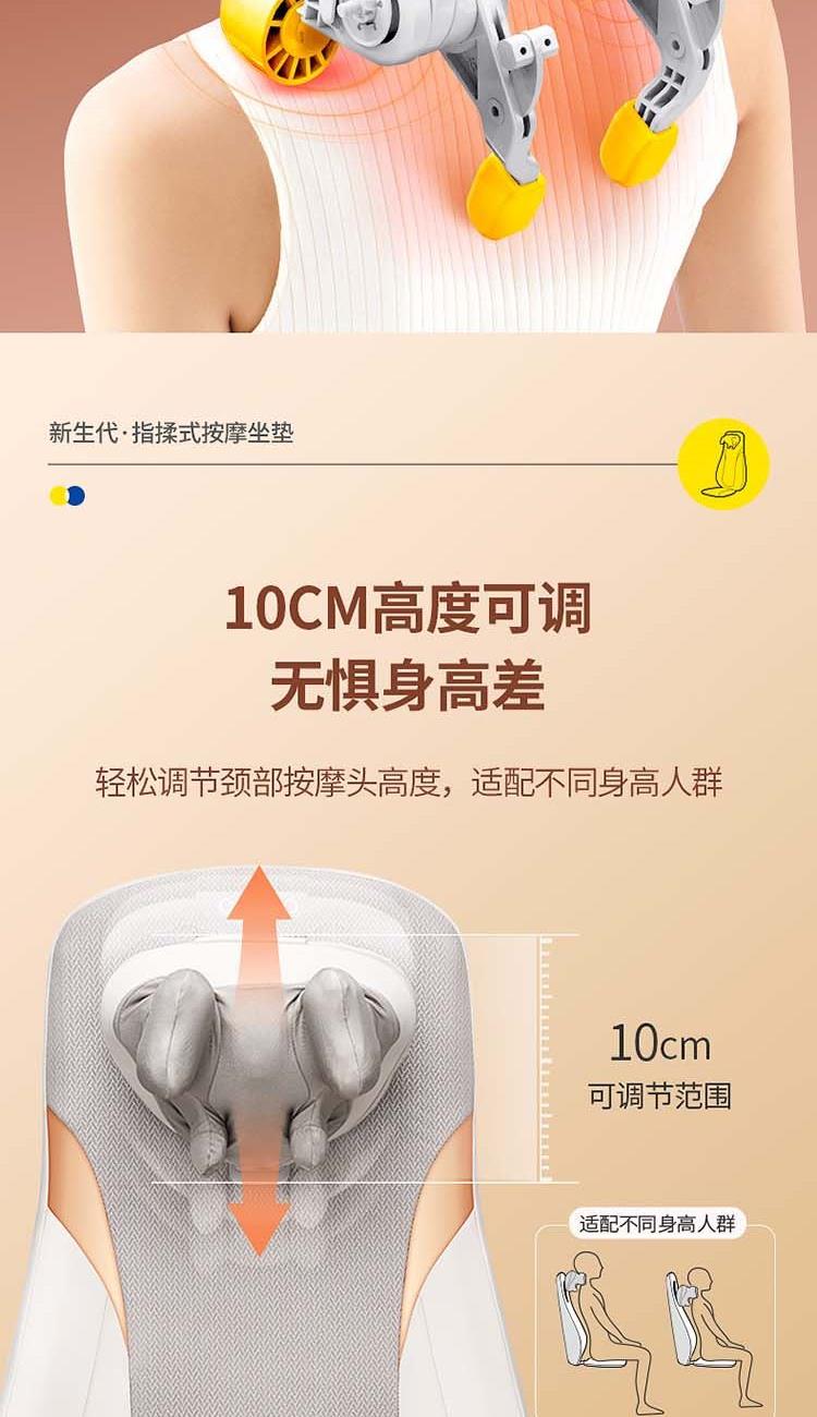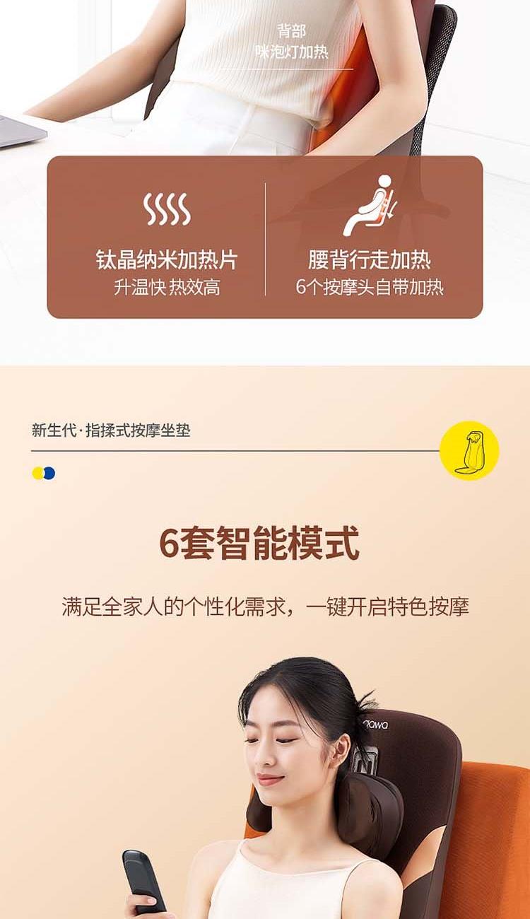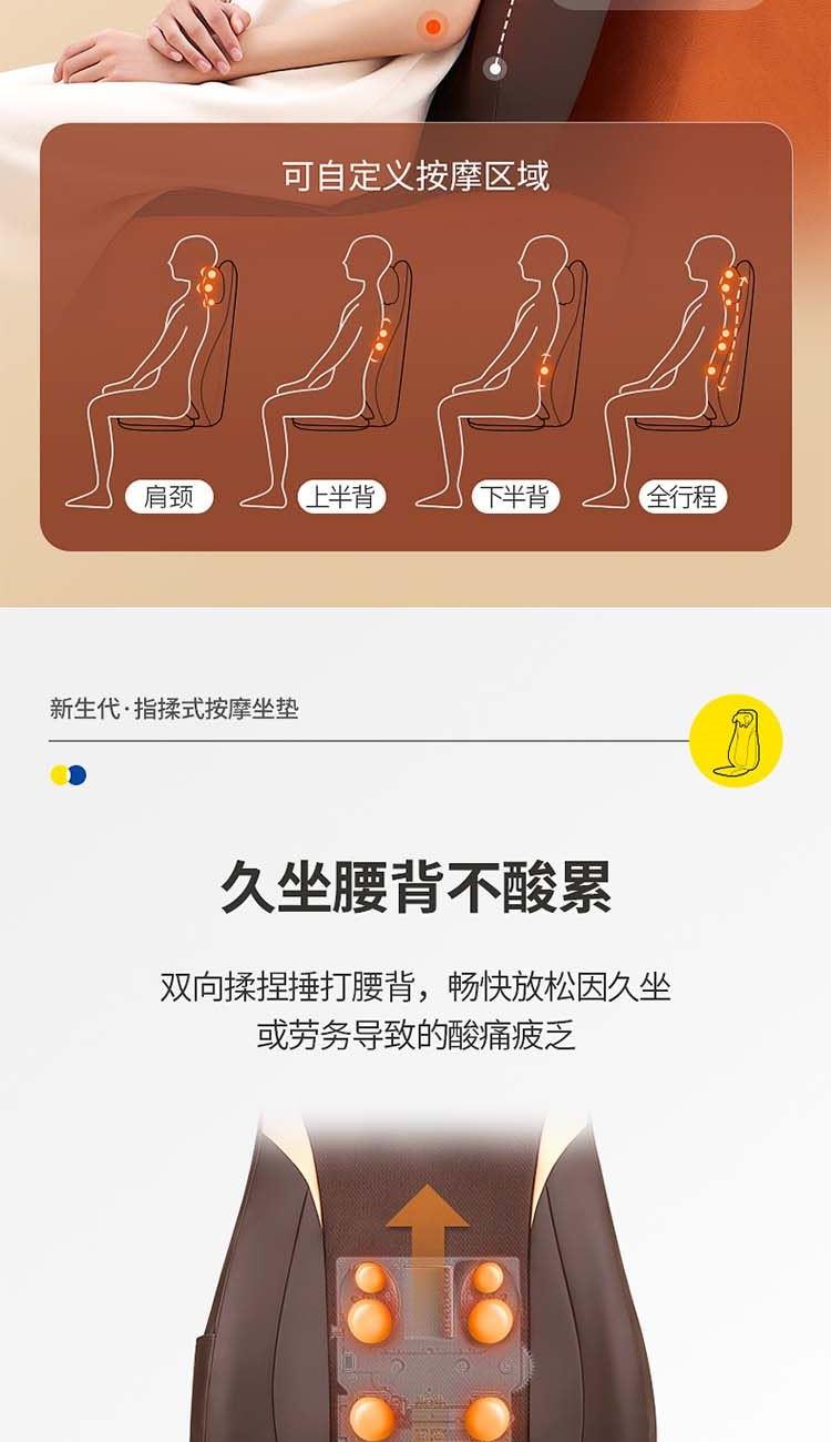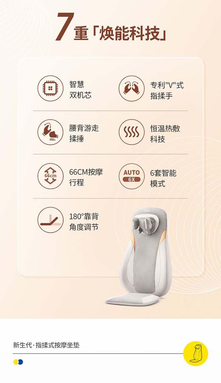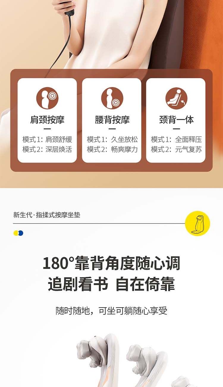 1.仿人手抓捏按摩头可正反转操控, 2.可调节按摩头位置; 3.有加热功能; 4.2个整机智能模式,2个颈部智能模式,2个腰背智能模式: