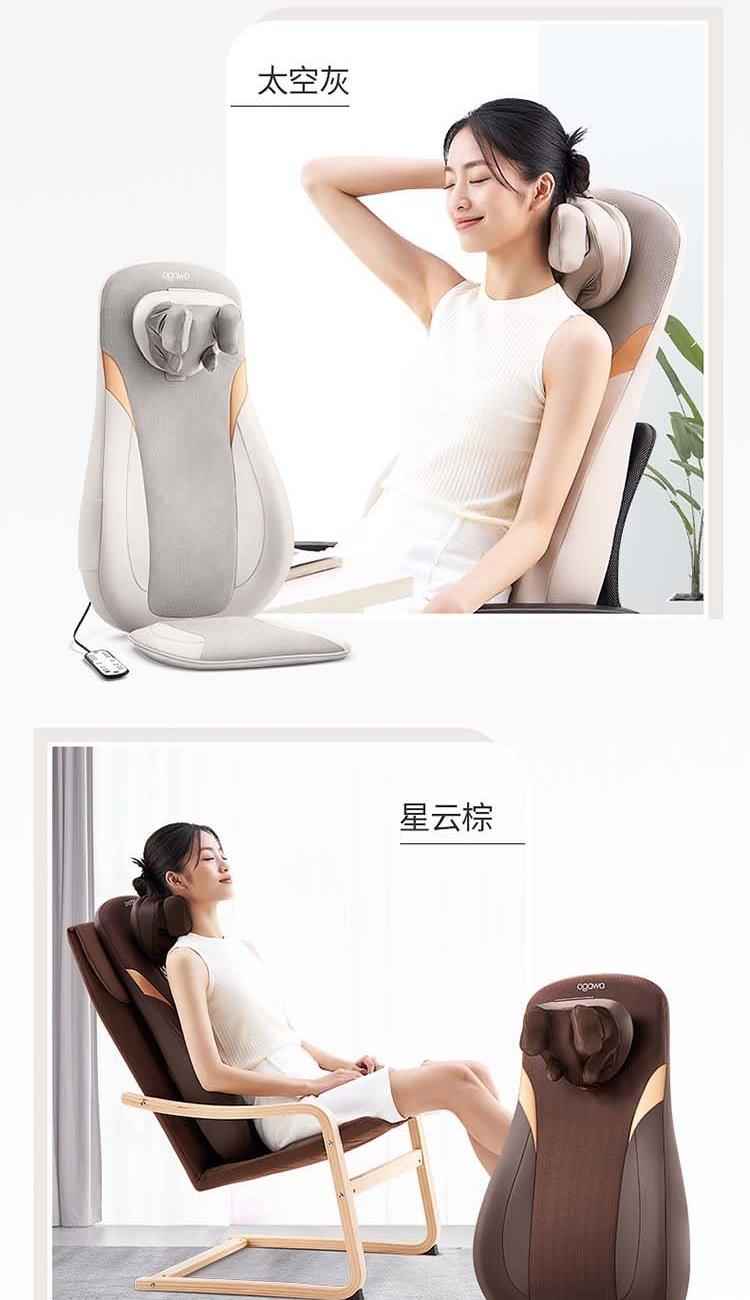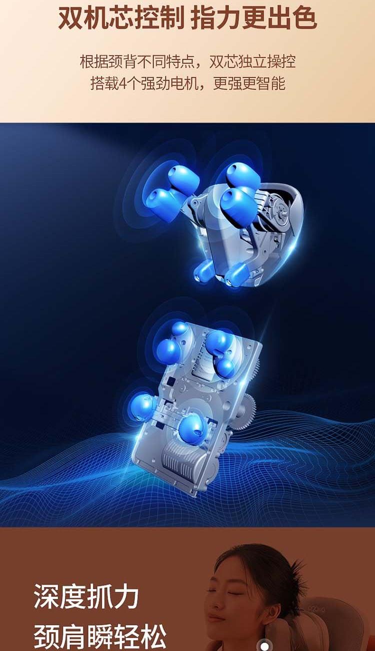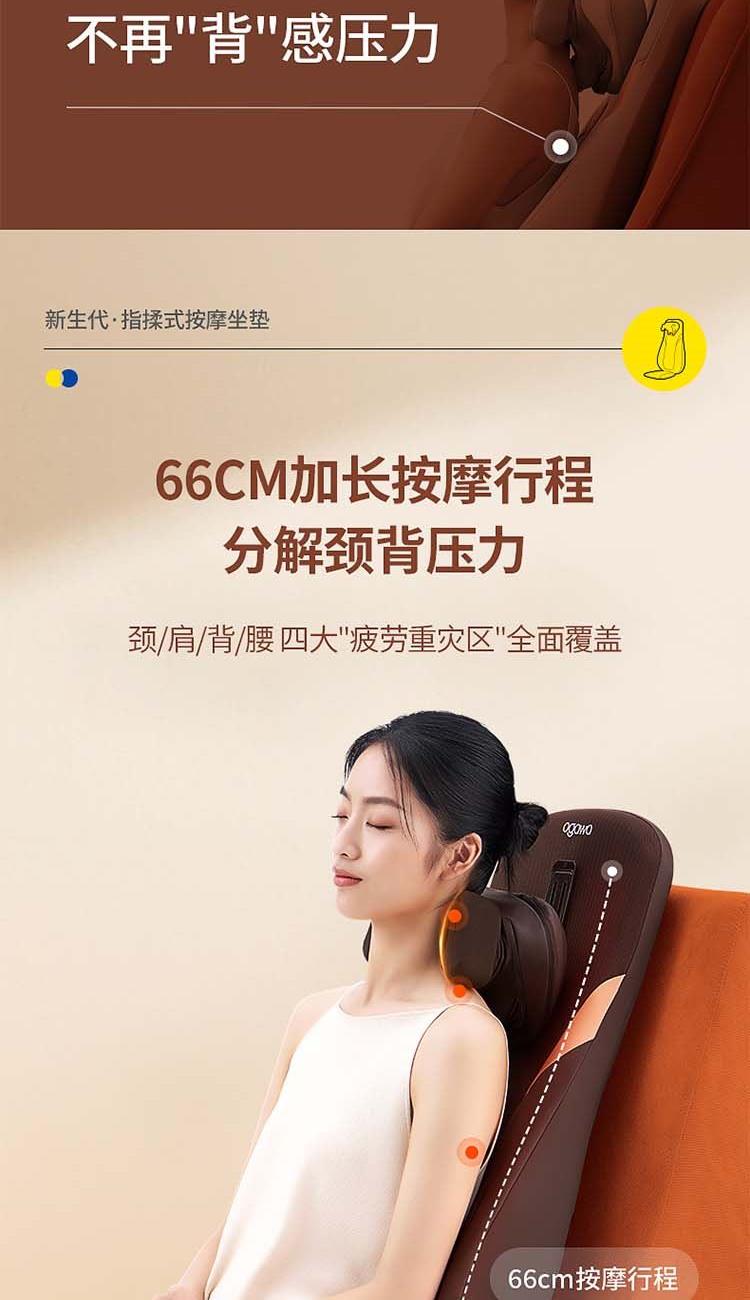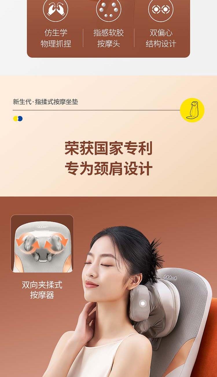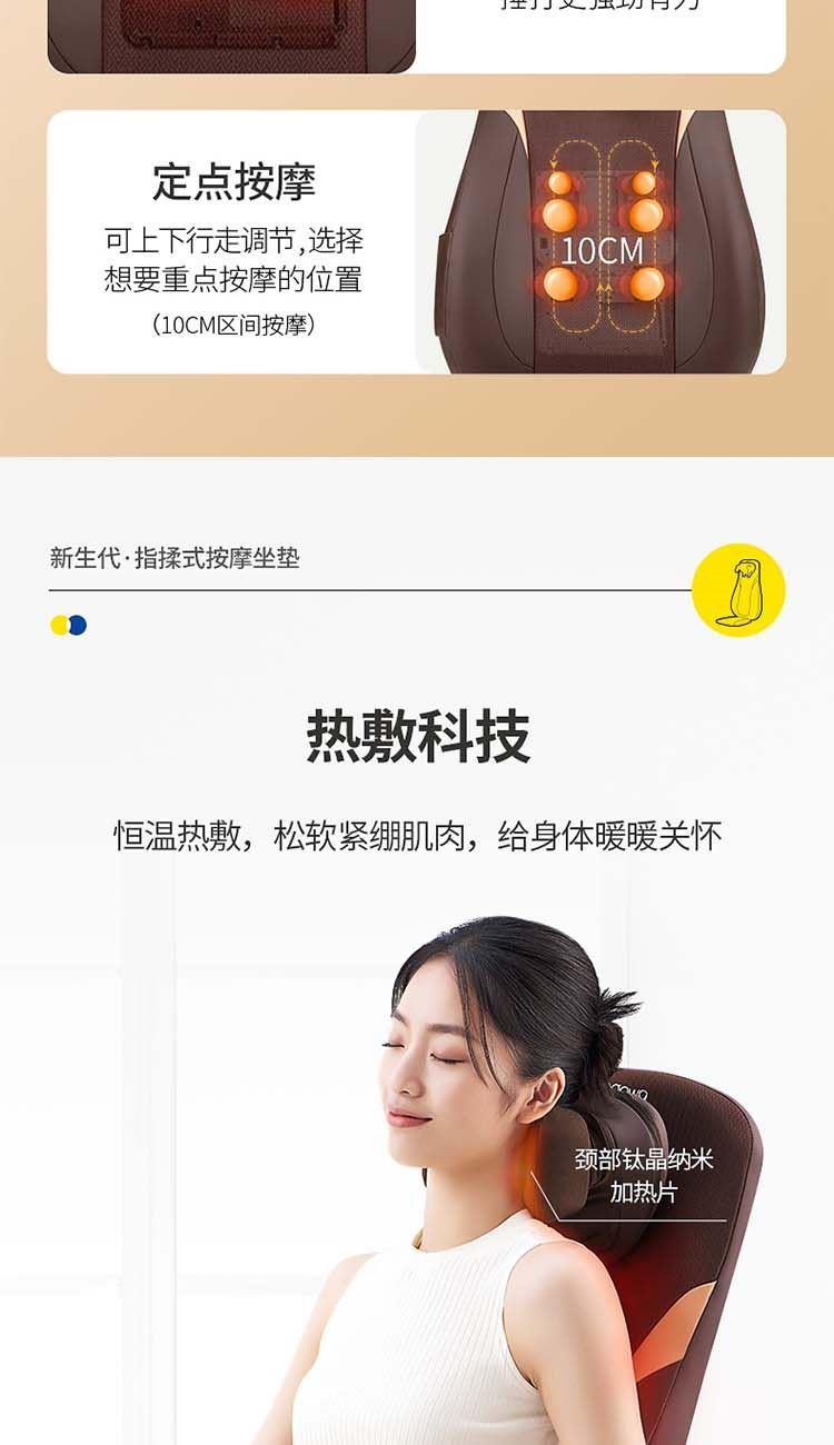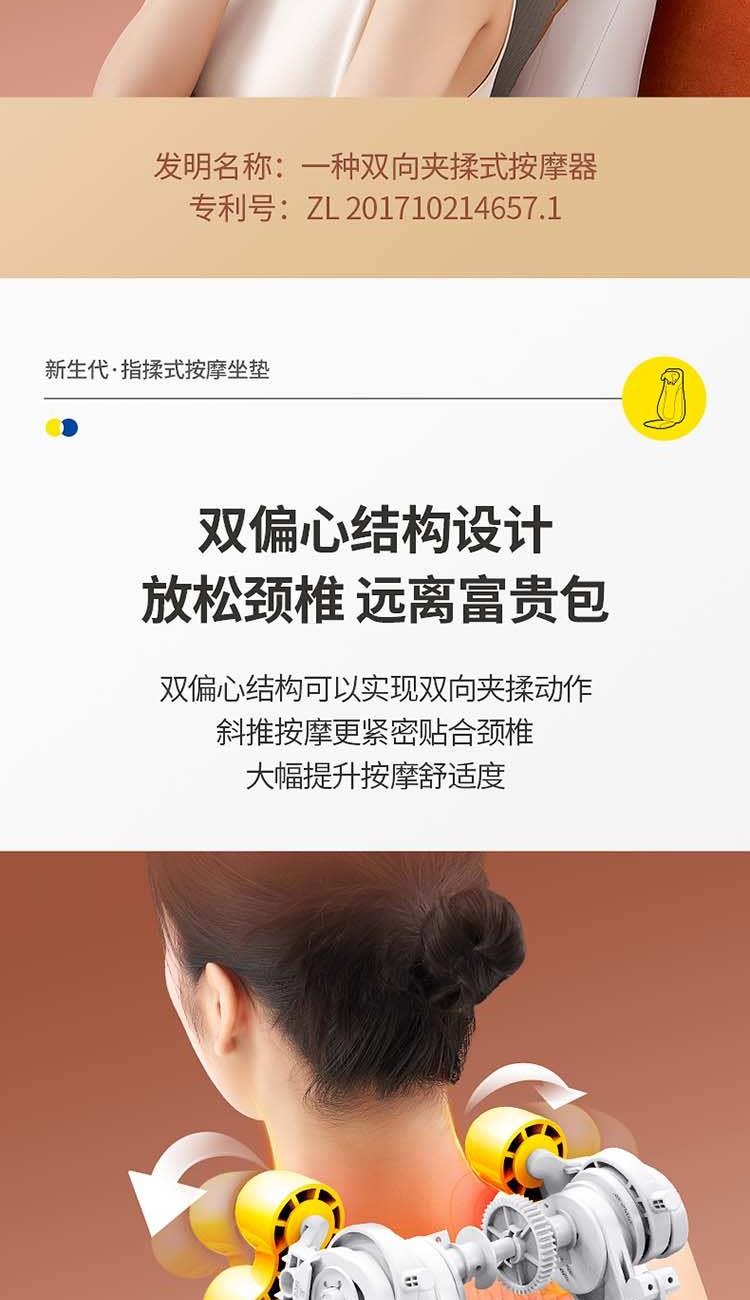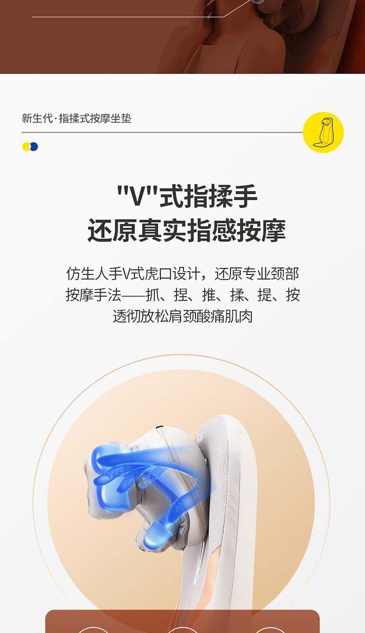 1.仿人手抓捏按摩头可正反转操控, 2.可调节按摩头位置; 3.有加热功能; 4.2个整机智能模式,2个颈部智能模式,2个腰背智能模式: