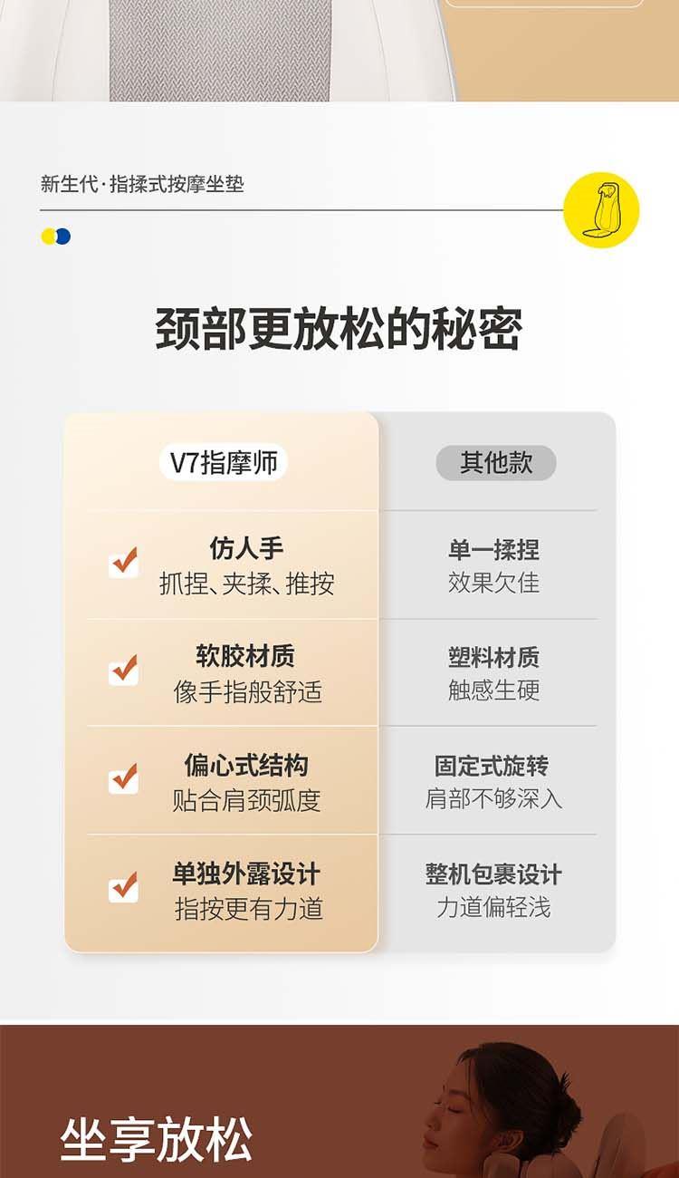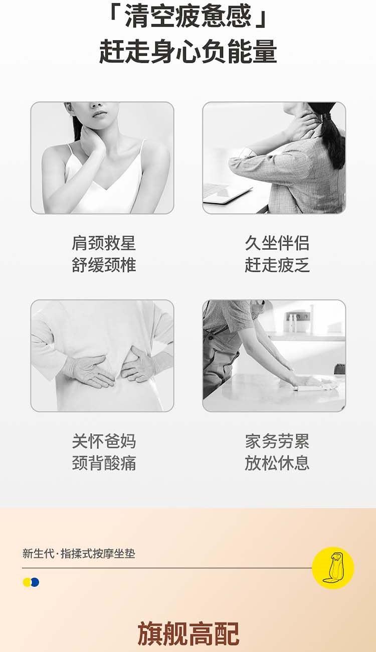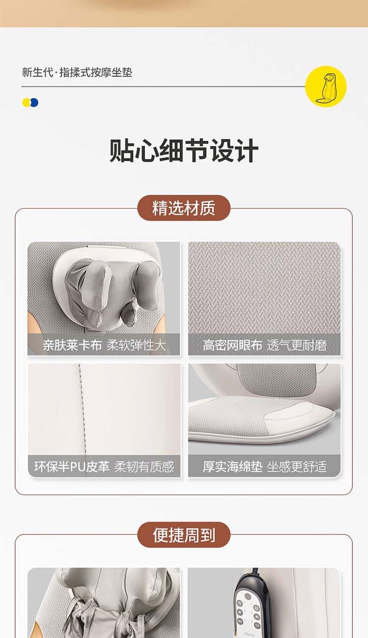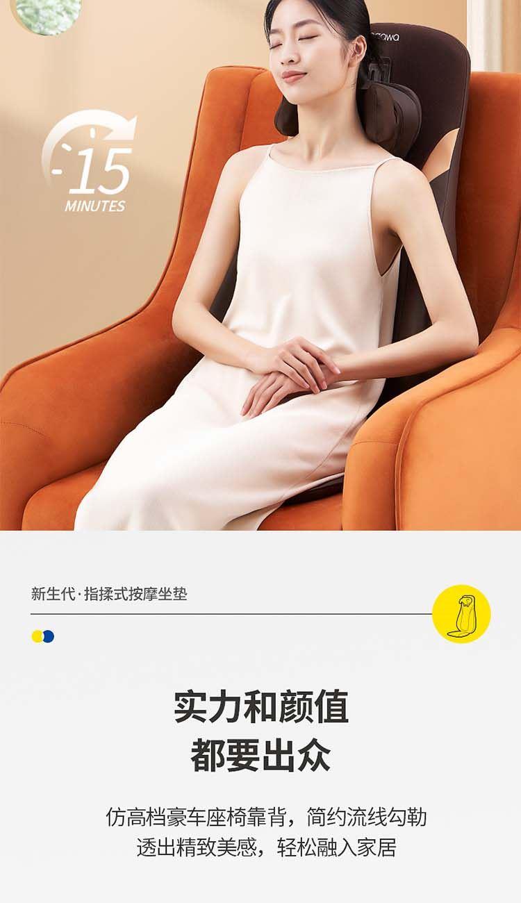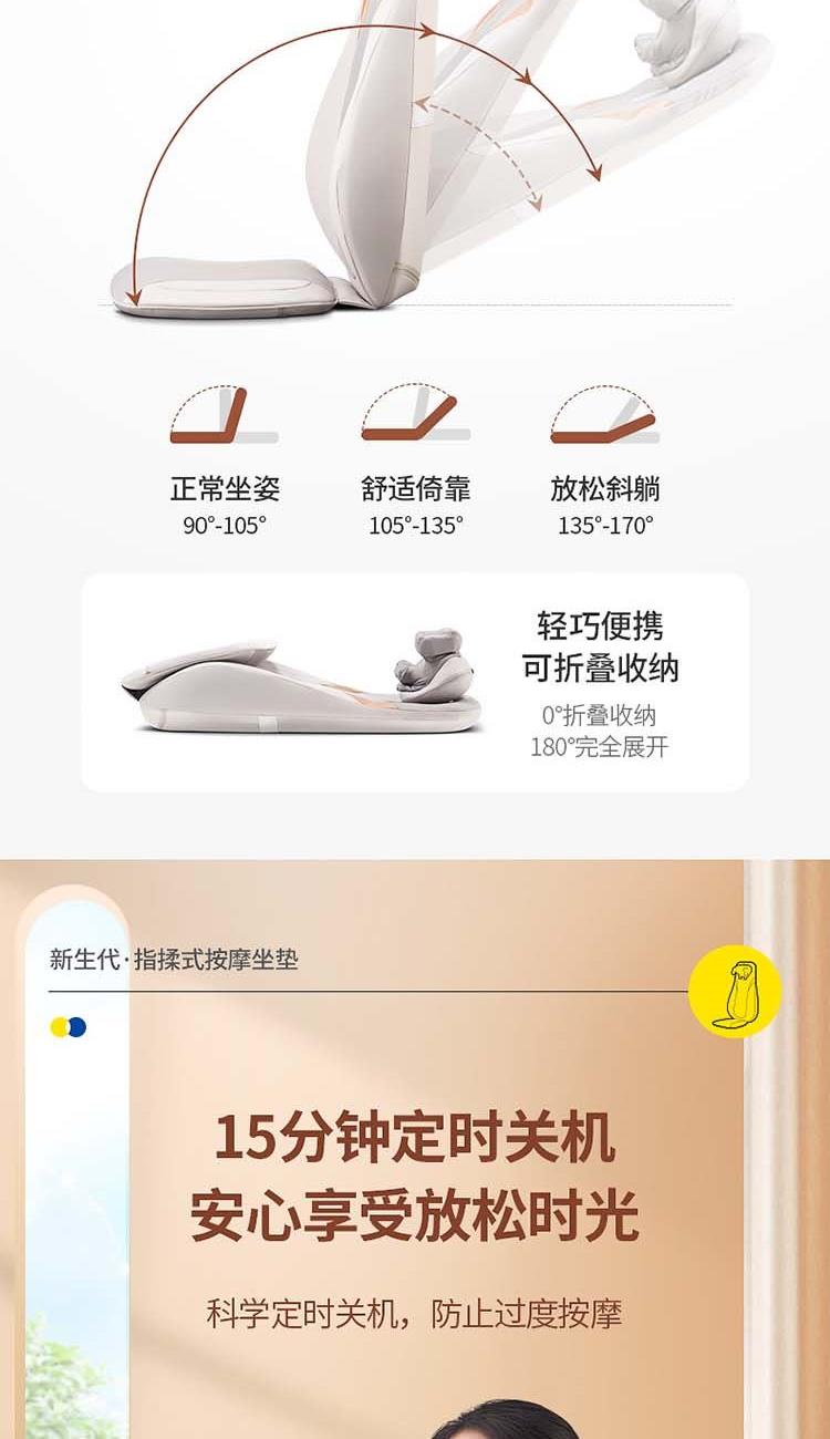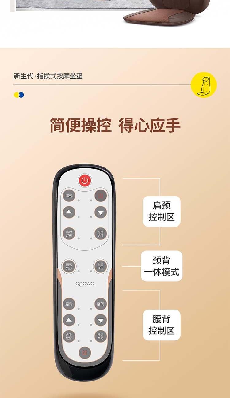 1.仿人手抓捏按摩头可正反转操控, 2.可调节按摩头位置; 3.有加热功能; 4.2个整机智能模式,2个颈部智能模式,2个腰背智能模式: