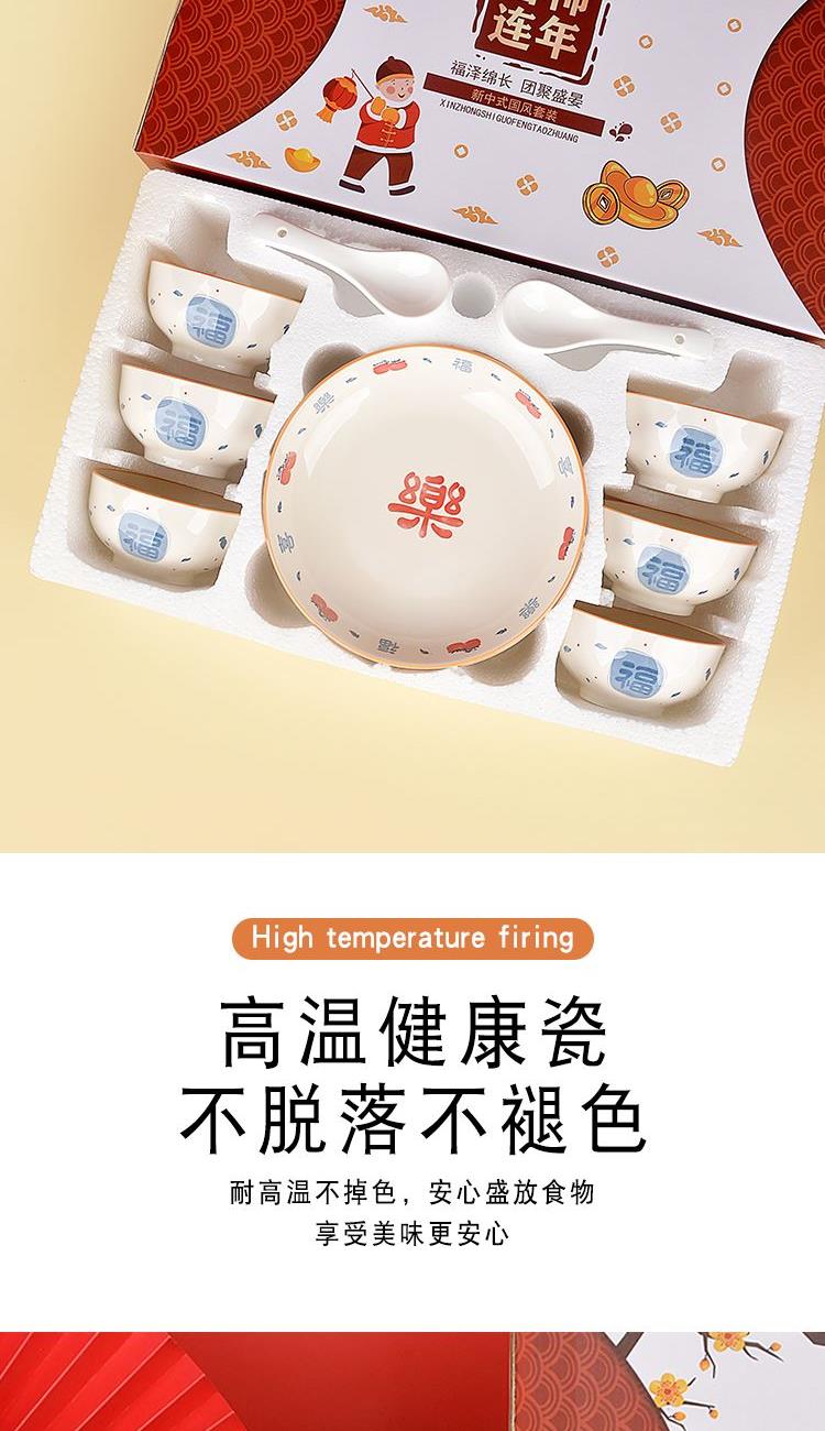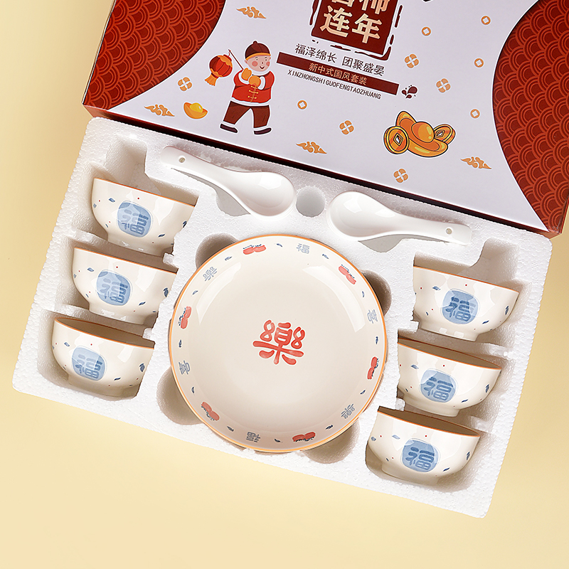 把这套“喜乐福”餐具当礼物再合适不过。细腻瓷质摸得到的踏实,灵动花纹藏着“愿大家常享乐、常伴福”的期许。花纹里的“福”气看得见,用它装着家常菜,连饭菜都多了份温馨。