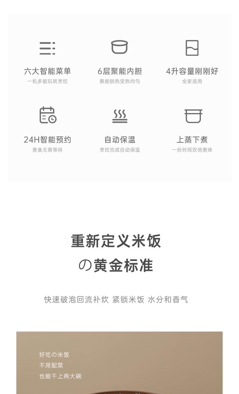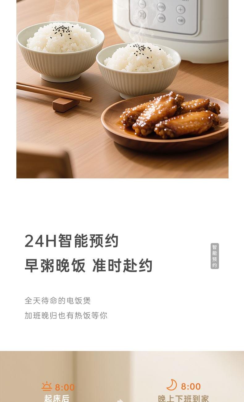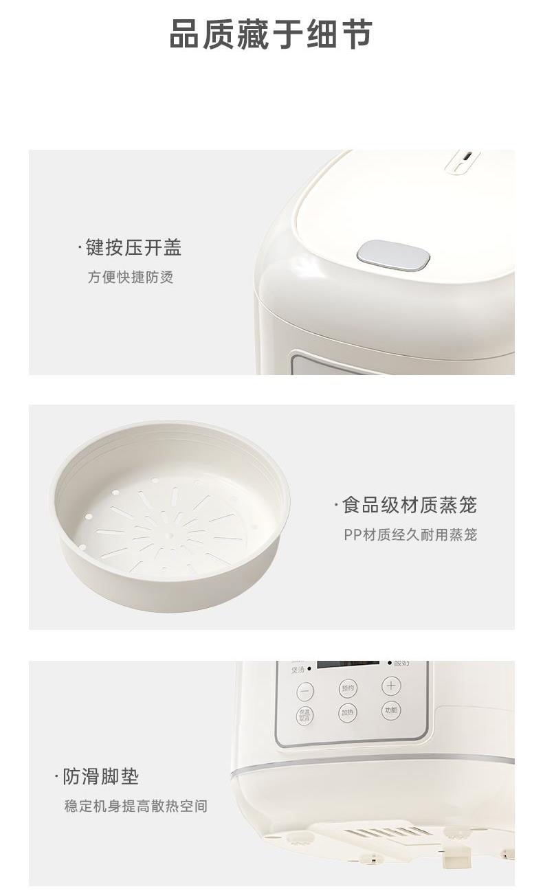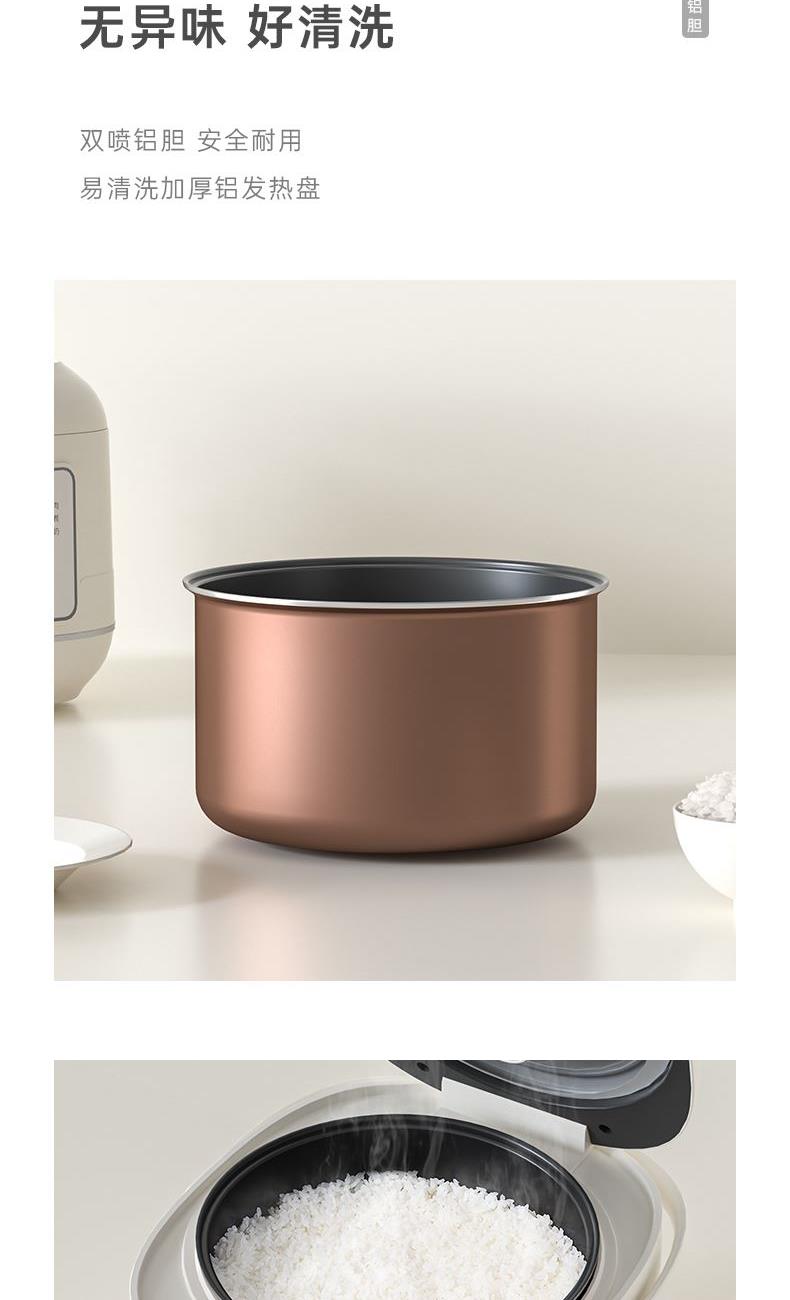 额定电压:220V~ 额定频率:50HZ 额定功率:700W 额定容量:4L 产品毛重:3.04kg 产品颜色:米白色 包装尺寸:340*290*270mm 包装清单:主机、电源线、饭勺、量杯、蒸笼、说明书 主要材质:铝胆 1.一键按压开盖,方便快捷防烫 2.4L黄金容量,满足日常家庭需求 3.双喷铝胆,耐用易清洗加厚铝发热盘 4.24小时智能预约,早粥晚饭,准时赴约 5.长效保温,每一口都新鲜温热 6.微电脑6大菜单,操作更简单