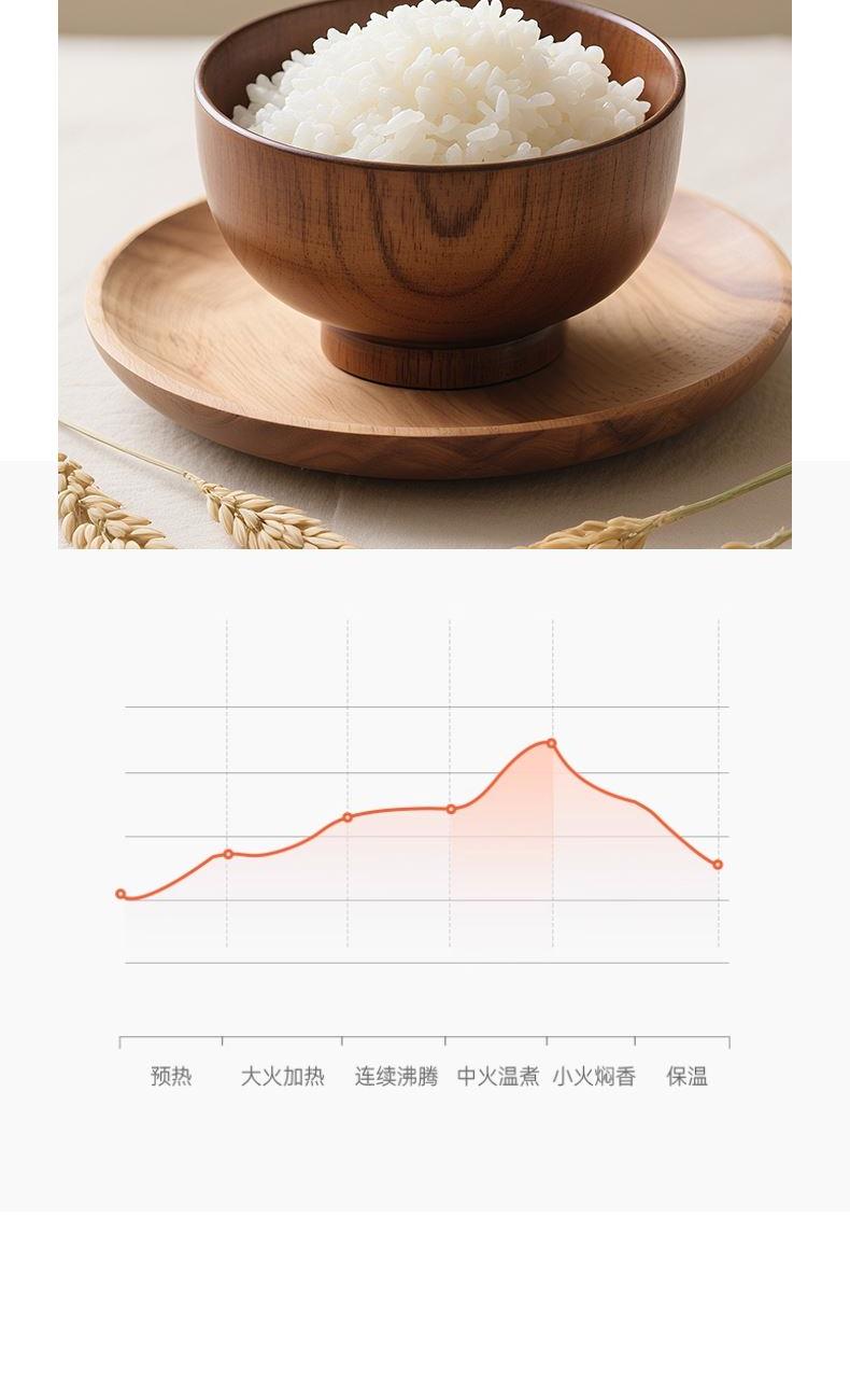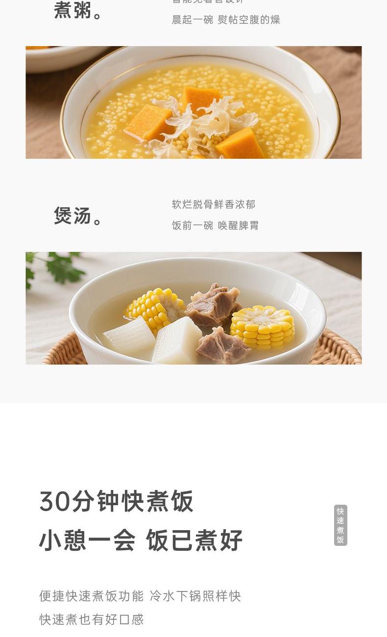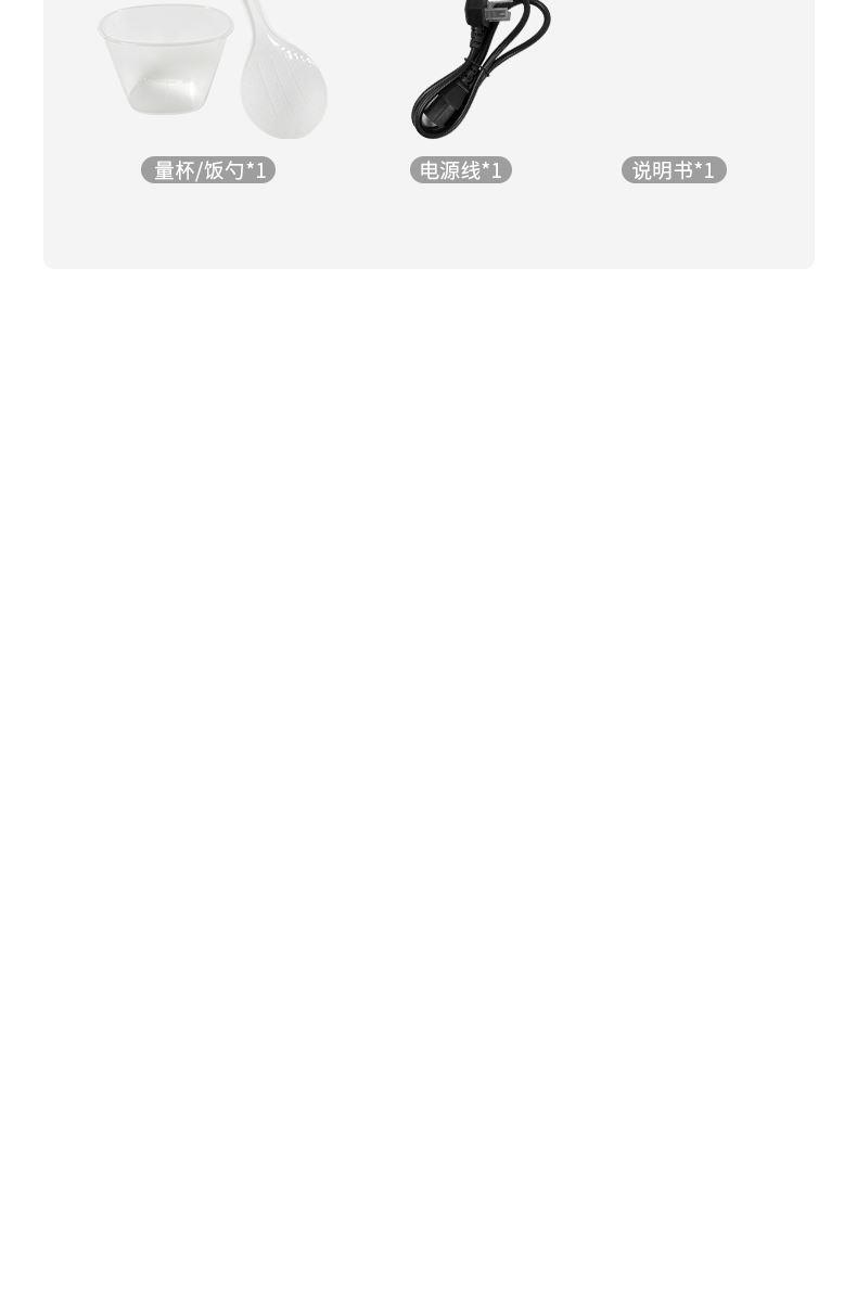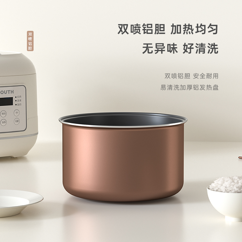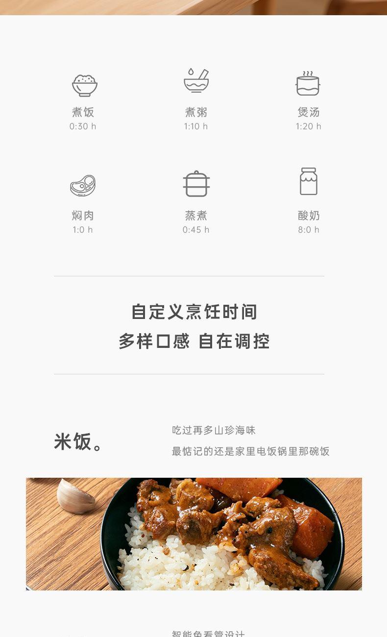 额定电压:220V~ 额定频率:50HZ 额定功率:700W 额定容量:4L 产品毛重:3.04kg 产品颜色:米白色 包装尺寸:340*290*270mm 包装清单:主机、电源线、饭勺、量杯、蒸笼、说明书 主要材质:铝胆 1.一键按压开盖,方便快捷防烫 2.4L黄金容量,满足日常家庭需求 3.双喷铝胆,耐用易清洗加厚铝发热盘 4.24小时智能预约,早粥晚饭,准时赴约 5.长效保温,每一口都新鲜温热 6.微电脑6大菜单,操作更简单