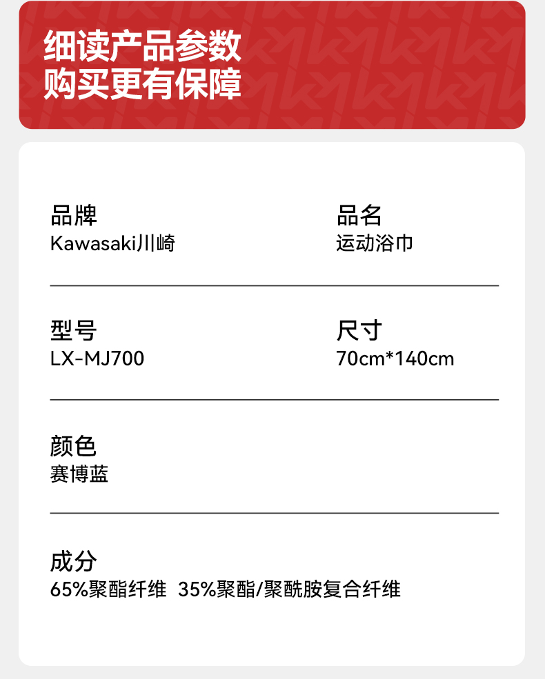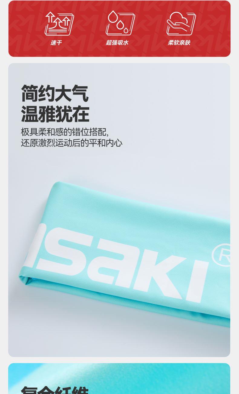 材质:65%聚酯纤维,35%聚酰胺复合纤维 尺寸:70*140cm 颜色:蓝色 适用:游泳健身 1.用多层冰丝纤维构造,一挥即凉,无需等待 2.吸汗舒适,保持身体干爽,快速速干 3.柔软,细腻吸水,不粘不腻 4.多场景应用,游泳健身,日常休闲