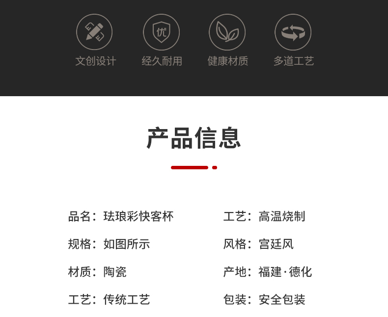 壶:10*9.5厘米252ml 品茗杯:6.5*3厘米50ml 天然矿物釉,高温烧制无铅镉 ,珐琅彩工艺,瓷质明亮通透,温润如玉,包装礼盒轻奢新颖,搭配礼盒包装,自用赠礼两宜,用陶瓷的温润,调和生活的棱角。
