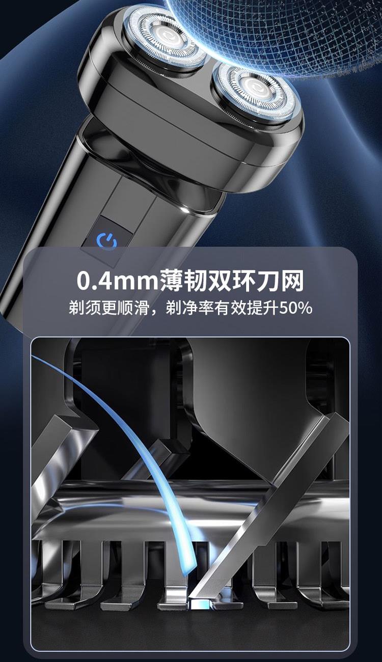 2、0.4mm薄韧双环刀网,剃须更顺滑,剃净率有效提升50%;