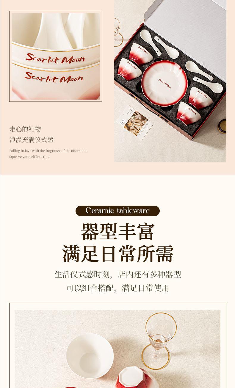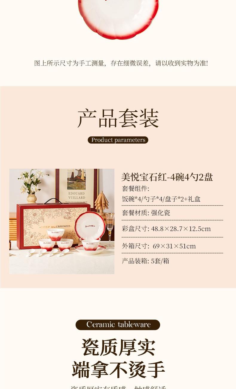美悦-宝石红-4碗4勺2盘 - 产品组成:整套= 4碗4勺2盘+1礼盒 产品材质:强化瓷 产品规格:陶瓷碗=口径11.5cm,高度7cm; 汤勺=长14cm,盘=口径20.5cm 彩盒尺寸:48.8×28.7×12.5cm 外箱毛重:13.1kg 外箱尺寸: 69x31x51 cm - 产品卖点: 采用“宝石红”渐变釉彩工艺,呈现红宝石般的奢华光彩,选用高温烧制。无论是乔迁,新婚或赠礼,都是不错的选择。让平凡的用餐变成红毯盛宴,用宝石般的光泽珍藏重要时刻。