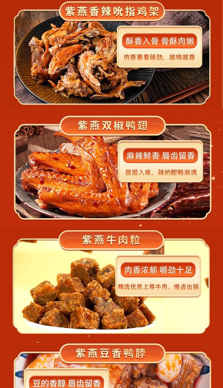 内容物配置: 紫燕百味鸡260g*1 紫燕香酥鸭400g*1 紫燕香辣吮指鸡架300g*1 紫燕双椒鸭翅82g*1 紫燕牛肉粒(五香味)60g*1 紫燕豆香鸭脖(香辣味)60g*1 紫燕风味鸡肉豆腩(鸡肉豆腩香辣味)60g*1 紫燕手撕素肉60g*1 紫燕金樽素鲍(红油素鲍鱼)60g*1 紫燕红油竹耳丝60g*1 紫燕蜂蜜花生(椒盐味)120g*1 至味佳年礼盒+组装+外盒