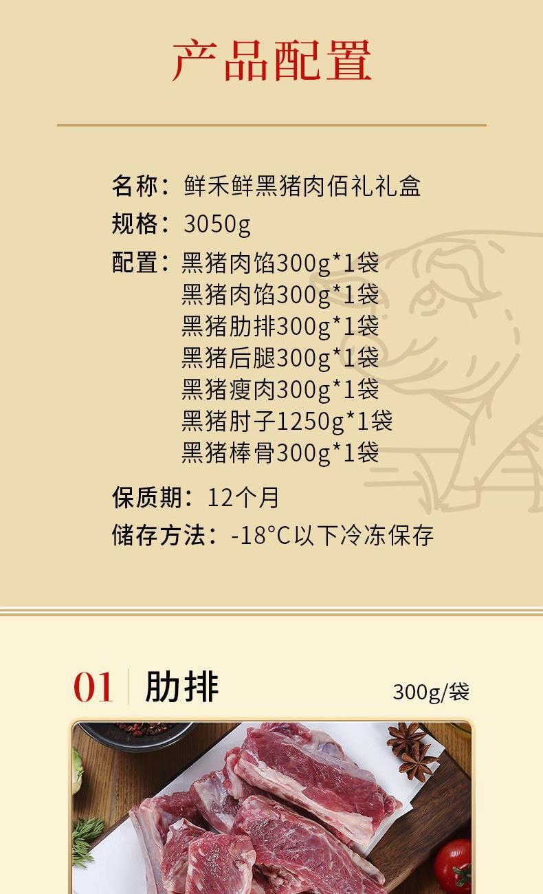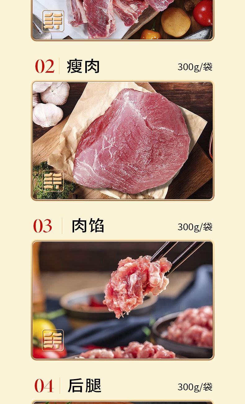 肉馅300g*2袋 肋排300g*1袋 后腿300g*1袋 瘦肉300g*1袋 肘子1250g*1袋 棒骨300g*1袋 3050g