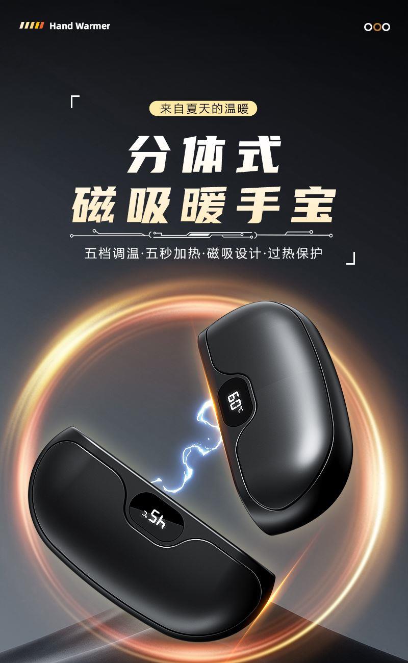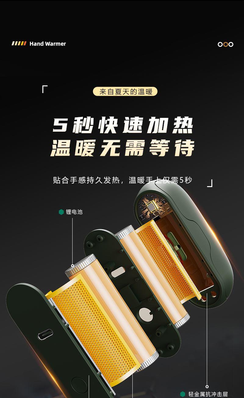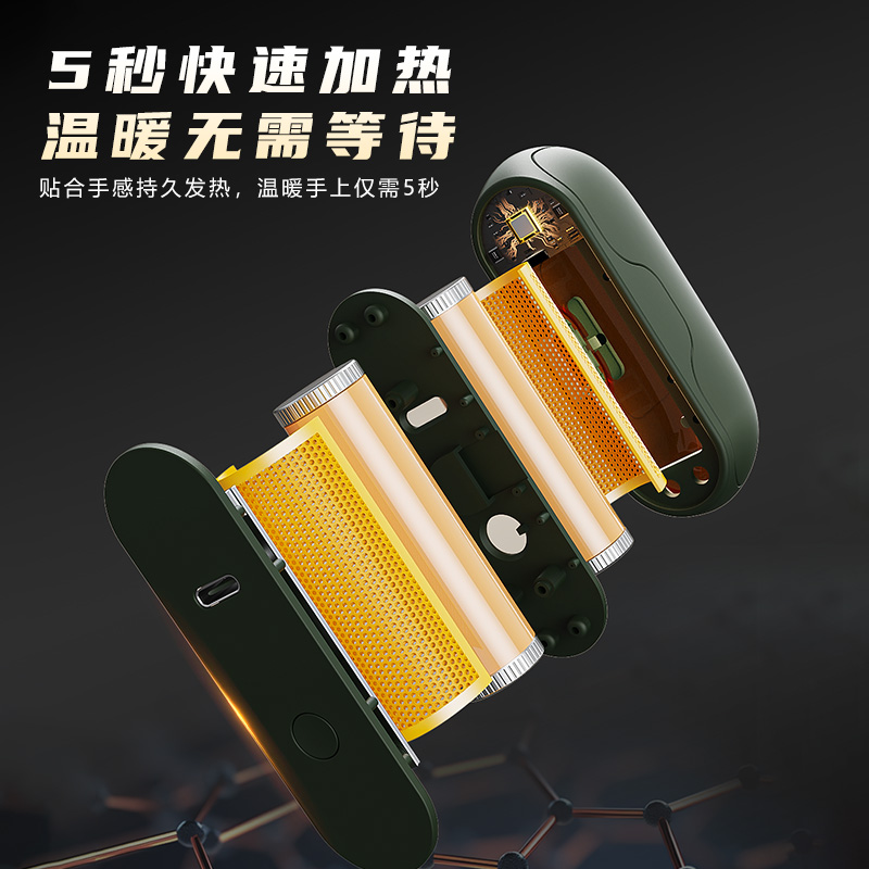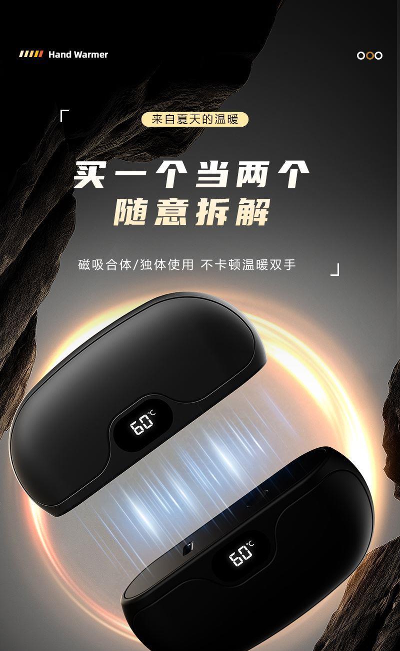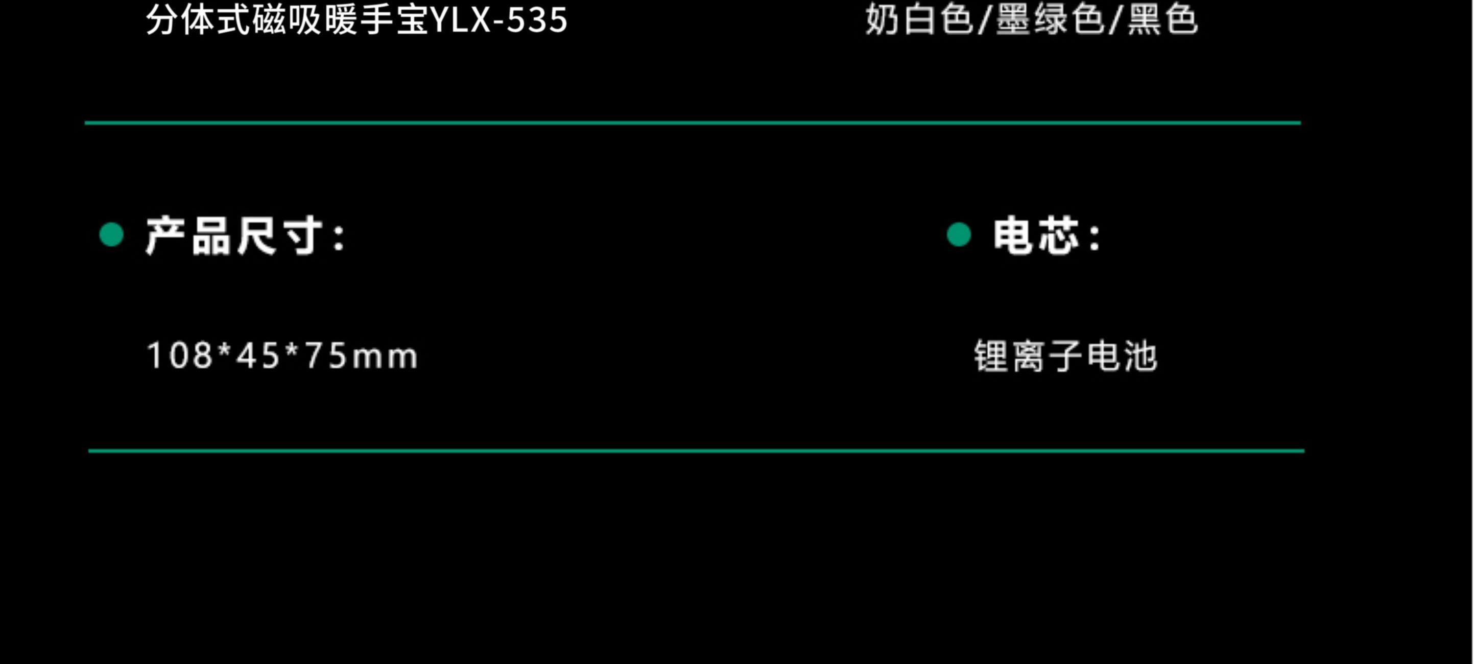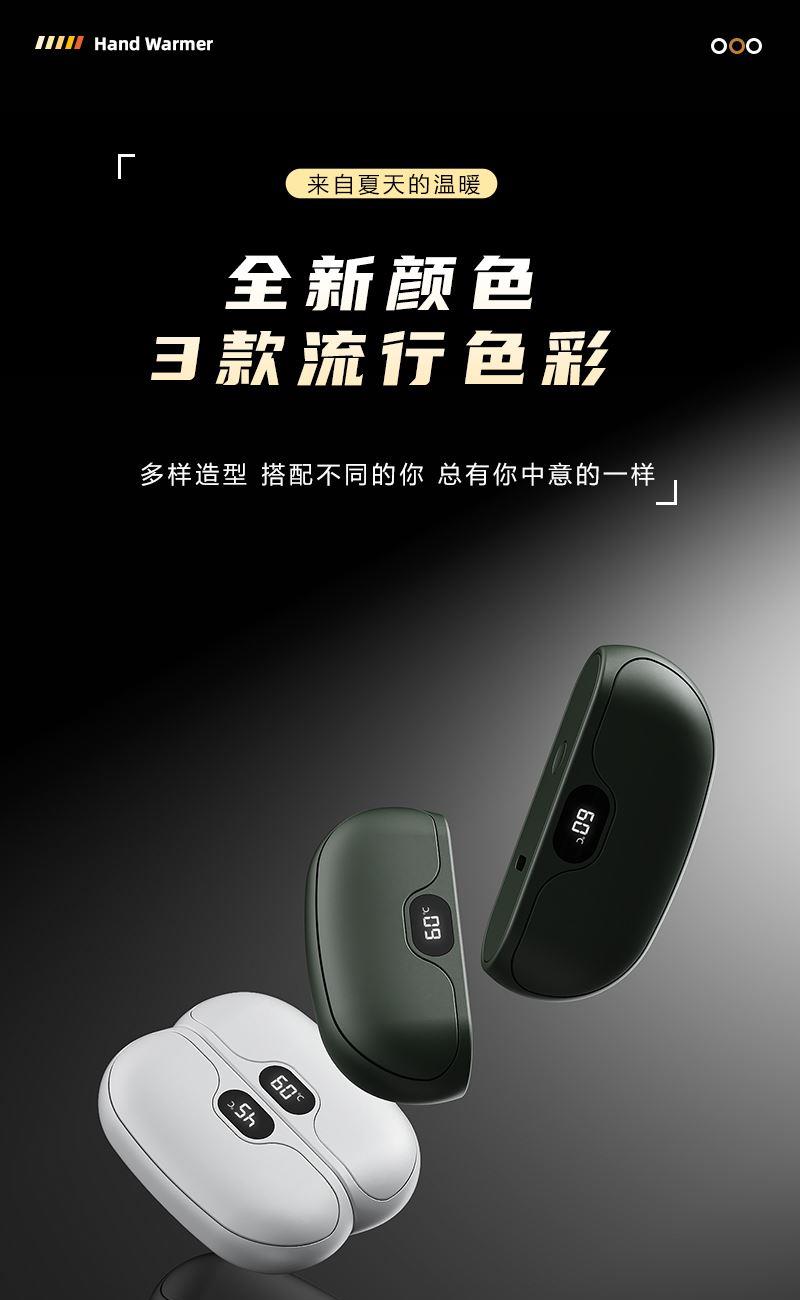 产品材质:ABS塑料+太空铝 产品尺寸:8.5*2.6*7.4cm 产品颜色:黑色 绿色 白色 净 重:145g 输入电流:5V/2A 电池容量:4800mAh 功 率:5w 使用时间:3-7小时 产品特点: 创意设计 可随意拆解 过热保护 温暖无忧虑 快速升温 温暖无需等待 智能高清显数 五档温度可调节