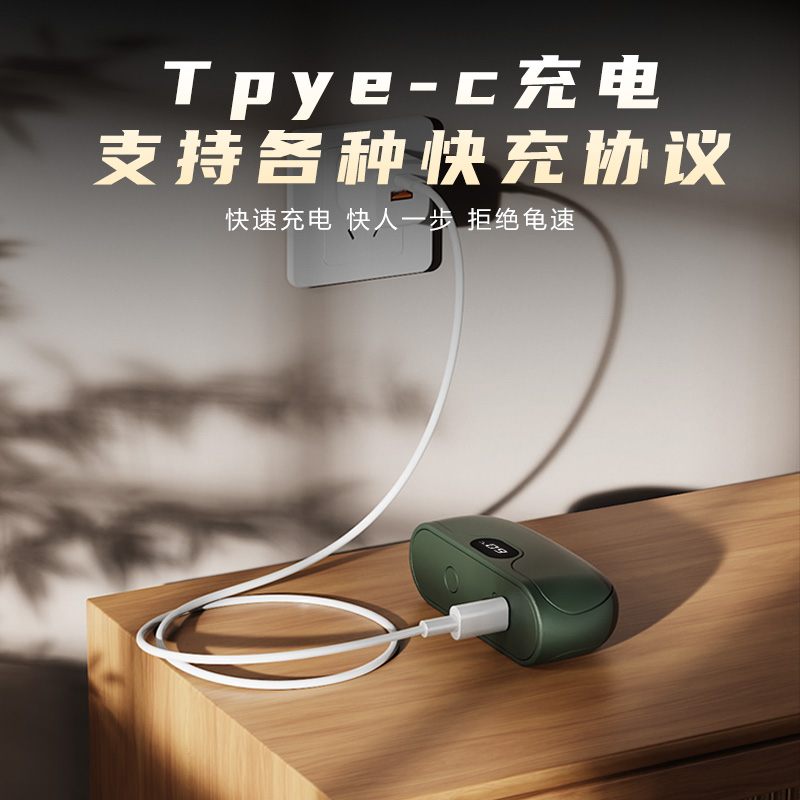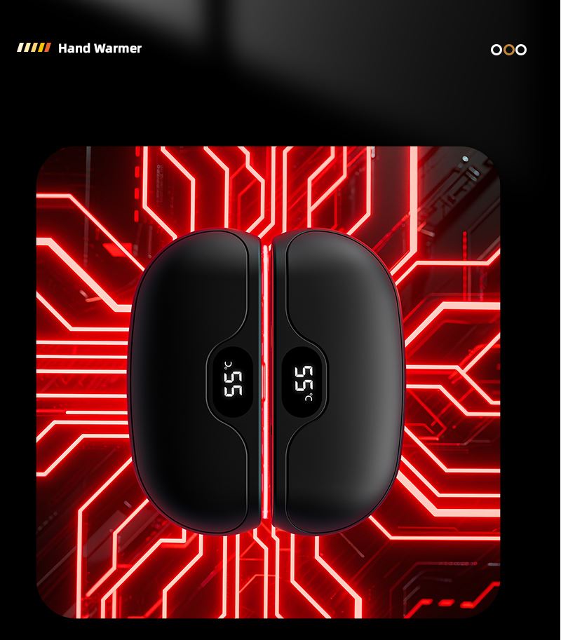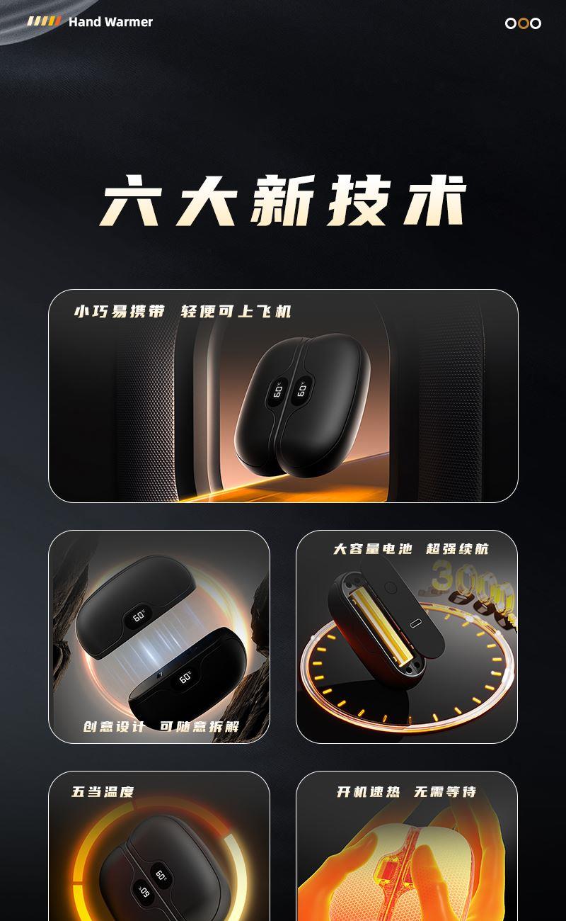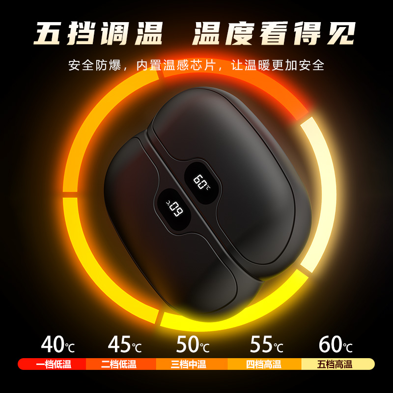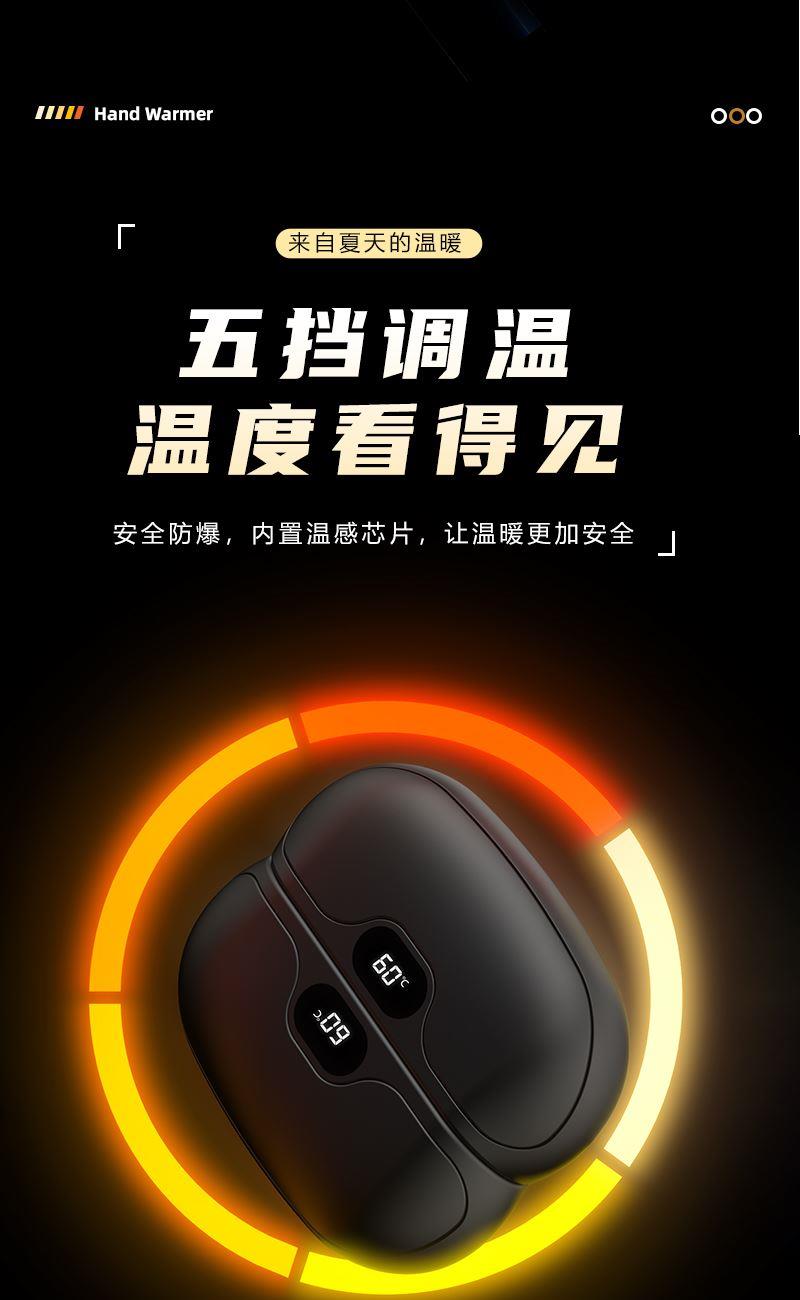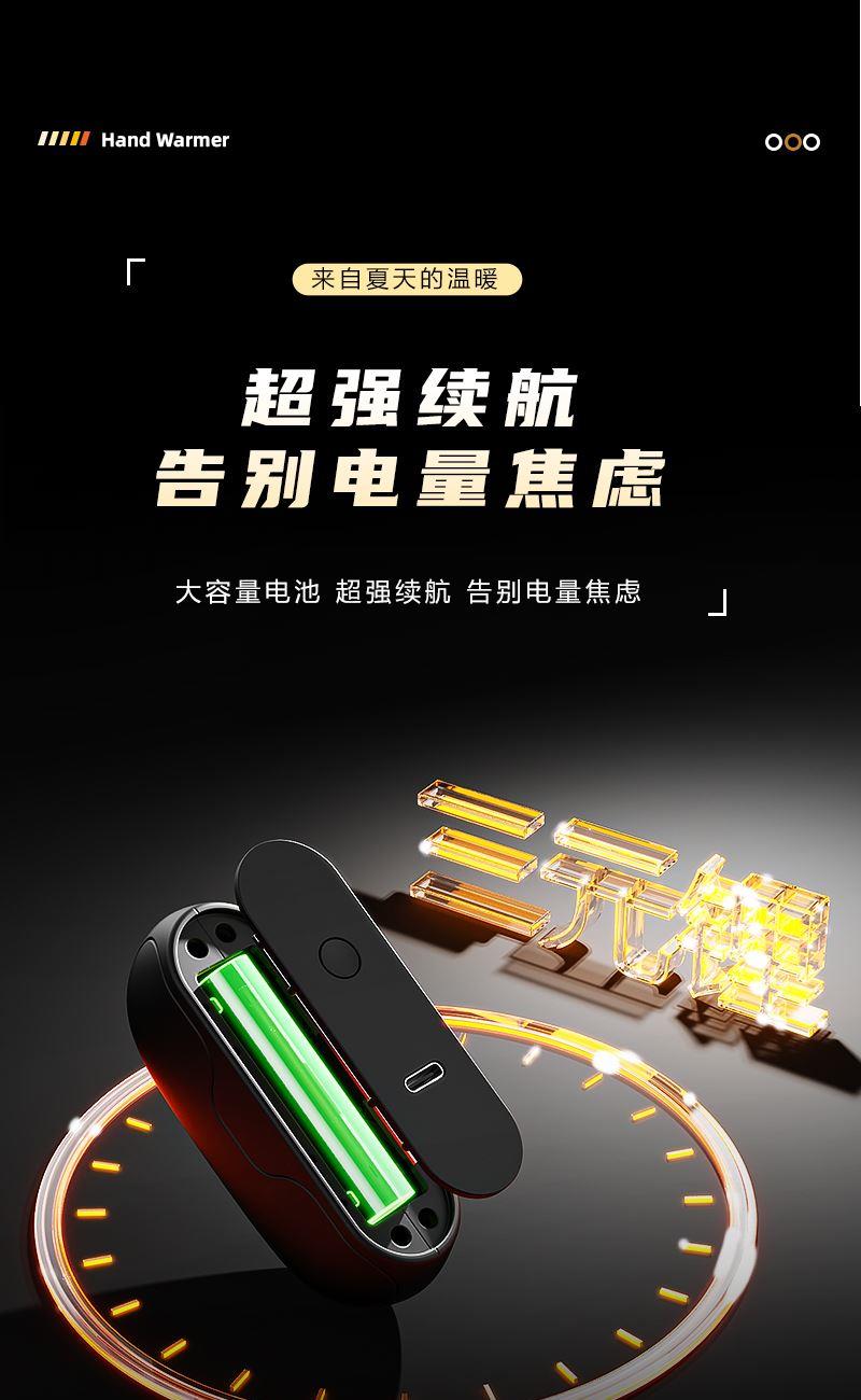 产品材质:ABS塑料+太空铝 产品尺寸:8.5*2.6*7.4cm 产品颜色:黑色 绿色 白色 净 重:145g 输入电流:5V/2A 电池容量:4800mAh 功 率:5w 使用时间:3-7小时 产品特点: 创意设计 可随意拆解 过热保护 温暖无忧虑 快速升温 温暖无需等待 智能高清显数 五档温度可调节