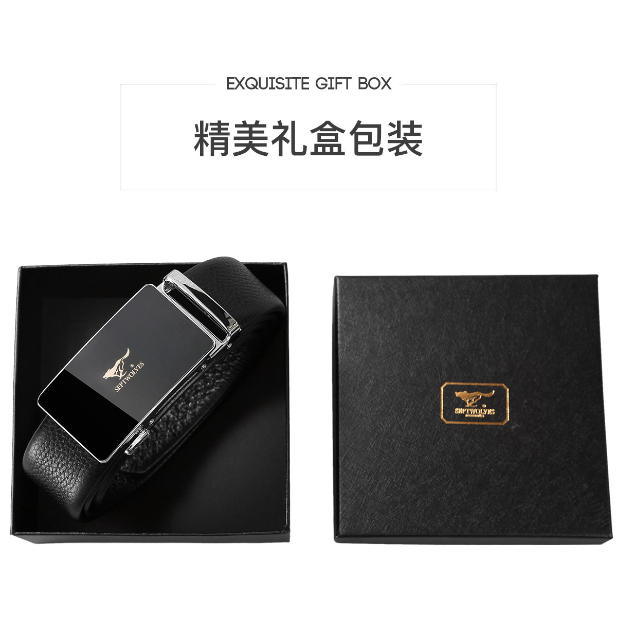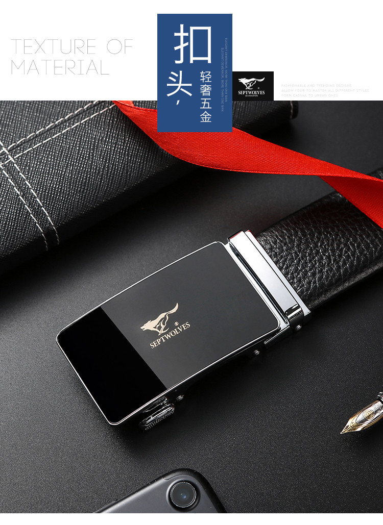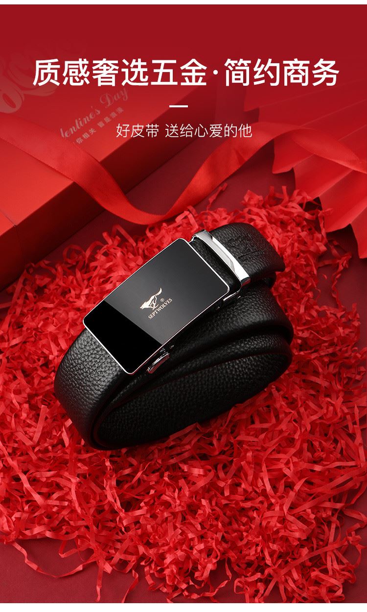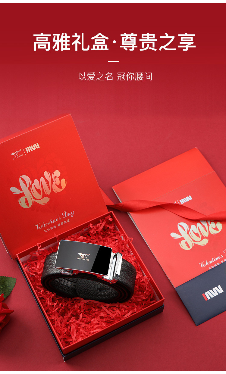 工艺:光面 带扣:自动扣 主体材质:头层牛皮 带扣材质:合金 风格:通勤风 商务风 宽度:3.5CM 送爱人,送长辈,送男士 时尚设计扣头,经典个性,简约百搭,磨砂背扣,材质柔软,手感舒适,经典狼标LOGO 代写贺卡,传递心声,精美礼盒,送礼佳品