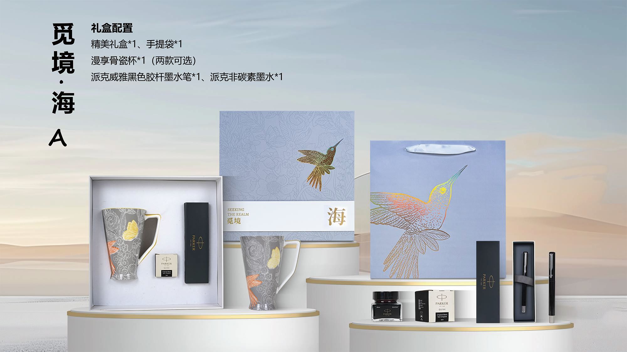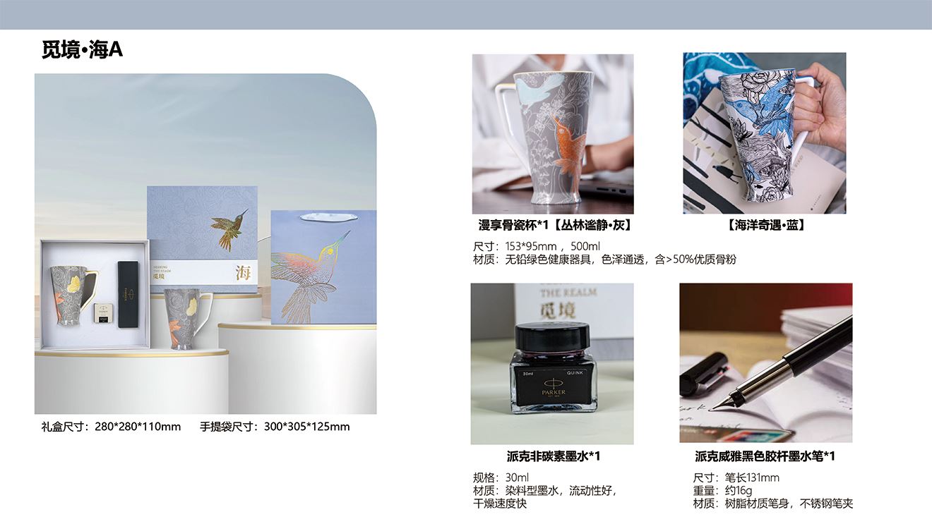 精美礼盒*1 手提袋*1 漫享骨瓷杯*1(两款可选) 派克威雅黑色胶杆墨水笔*1 派克非碳素墨水*1