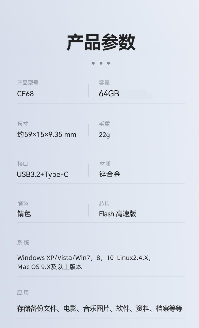 双接口均采用USB3.2,广泛兼容和更多设备对口 Flash 芯片高速版,360°旋转保护安全堡垒 锖色电镀金属效果, 原厂包装,送礼佳品。 产品尺寸:59x15x9.35 mm 单品重量:22g