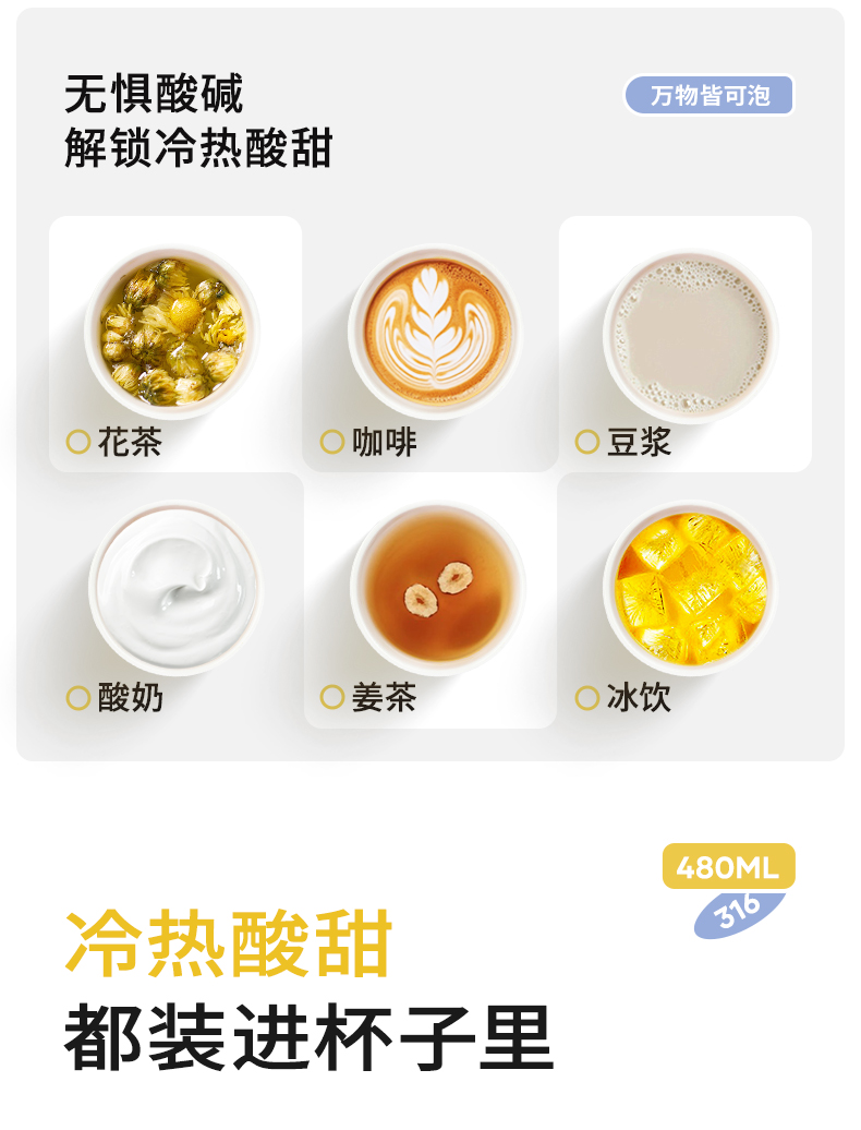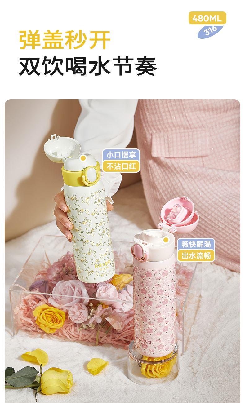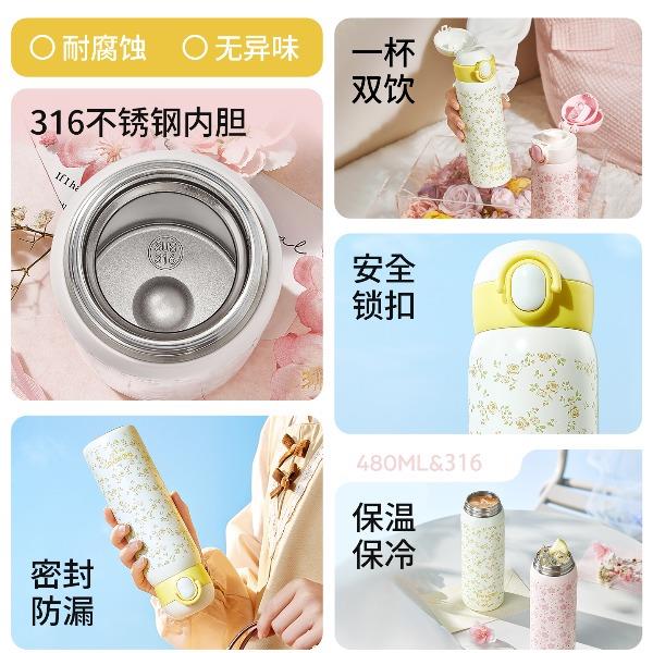 型号:JV012575-0480 颜色:碎花墨玉黑 桃桃樱花粉 琥珀玫瑰黄 极光玫瑰紫 材质:316不锈钢 容量:480ml 材质:杯盖、内塞/食品级PP材质内胆/316不锈钢材质外壳/304不锈钢材质密封件/食品级硅胶吸嘴/吸管:硅橡胶 尺寸:内口径:4cm 高:22.7cm 1:限定立体碎花图案 2:316不锈钢内胆易清洗,耐酸碱,无异味 3:一盖双饮喝水更轻松 4:便携车载密封防漏不易撒