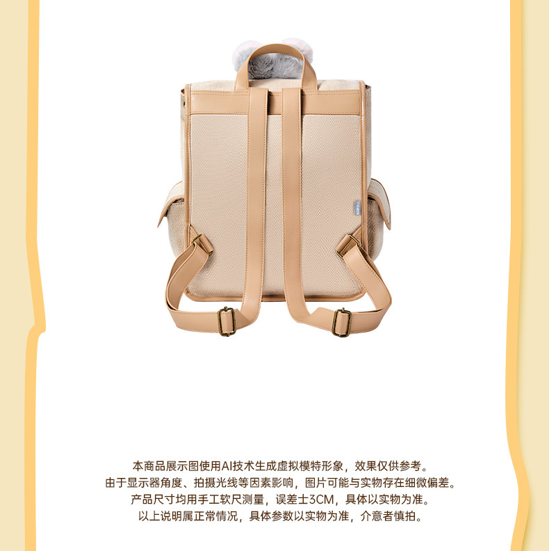 材质:聚酯纤维 尺寸:32*16*35CM 建议身高:120-170cm 卖点: ①可爱软萌包包大容量很能"装" ②魔法口袋多隔层·不凌乱,一包多用时尚百搭 ③可调节肩带,长度自由掌控 怎么背都有型 ④结实提手,随心拎放 出行更从容;强力磁吸,一吸即合 轻松随行 ⑤蓬松毛绒,毛茸茸的“空气感”软到心都化了