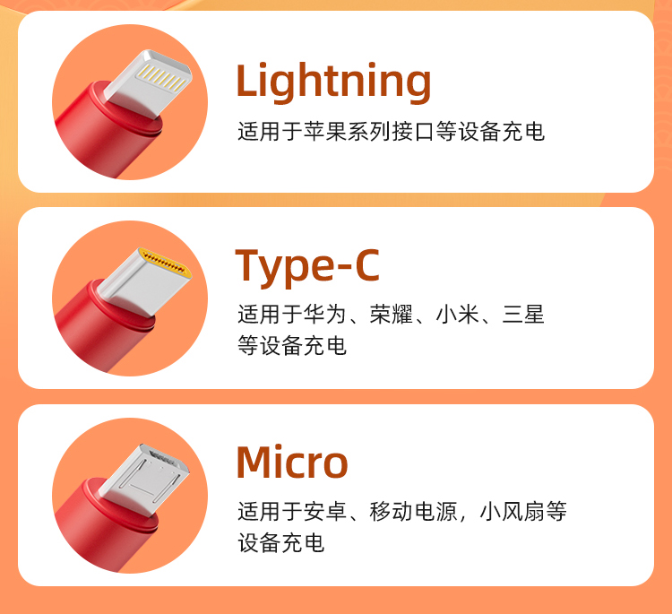 电流:Type-C-6A、lightning-2.4A. Micro-2A